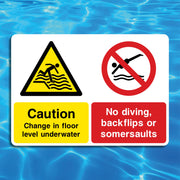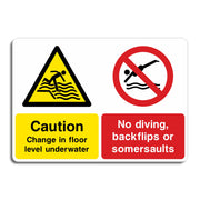 Caution Change In Floor Level Underwater No Diving Backflips Or Somersaults Sign