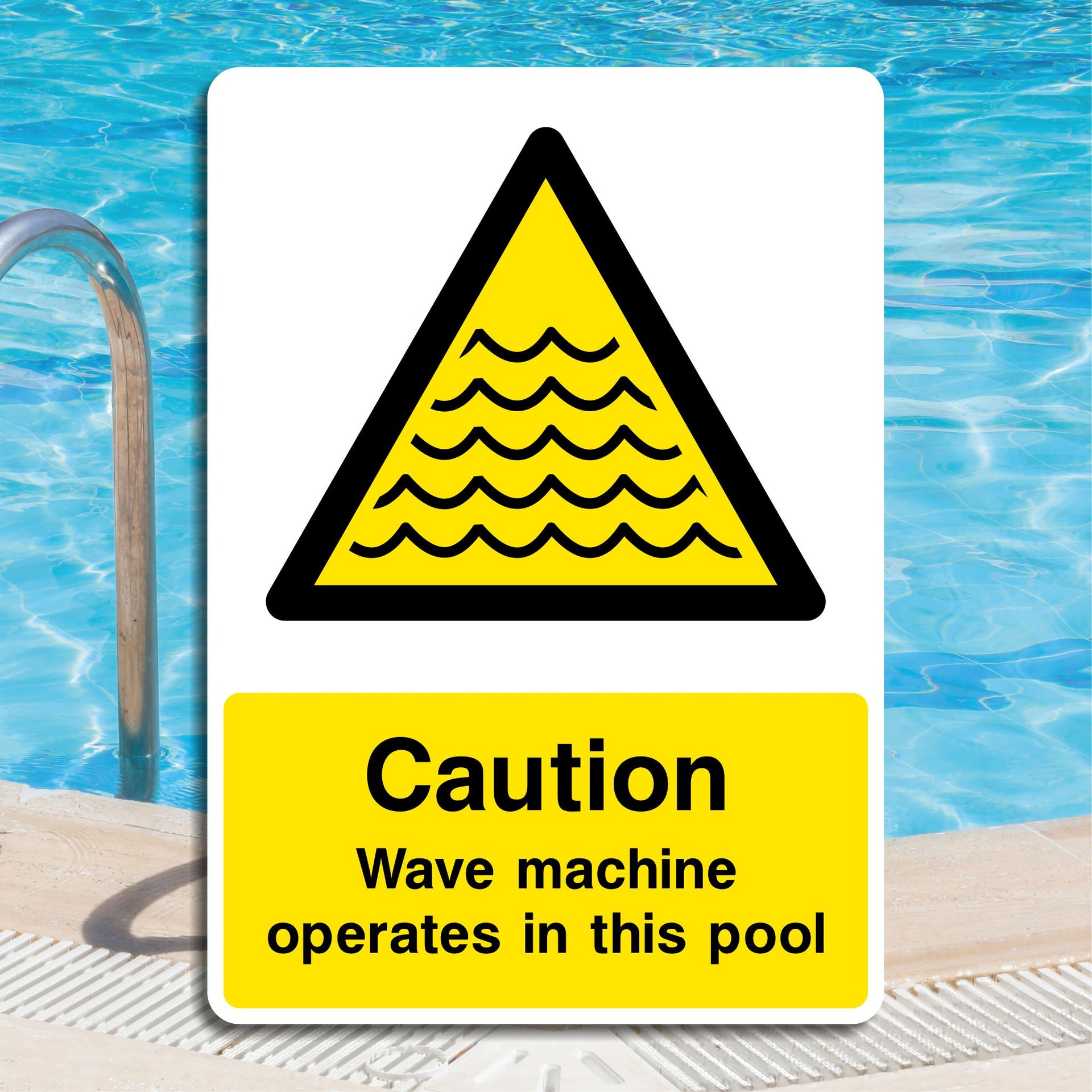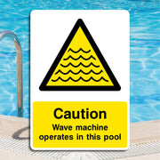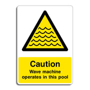 Caution Wave Machine Operates In This Pool Signs are intended to inform swimmers and pool users that an automated wave-generating system is active in the pool area. Their primary purpose is to warn individuals about the presence of artificial waves that can create unexpected water movement, which may affect swimming conditions and balance. All our safety signs are compliant with BS EN ISO 7010 where applicable.