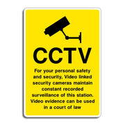 CCTV For Your Personal Safety and Security Video Linked Security Cameras Maintain Constant Recorded Surveillance of This Station Signs are detailed informational notices typically found in public transport environments like train or bus stations. By clearly stating that cameras are linked and recording constantly, the signs discourage theft, vandalism, harassment, and other unlawful actions. All our safety signs are compliant with BS EN ISO 7010 where applicable.