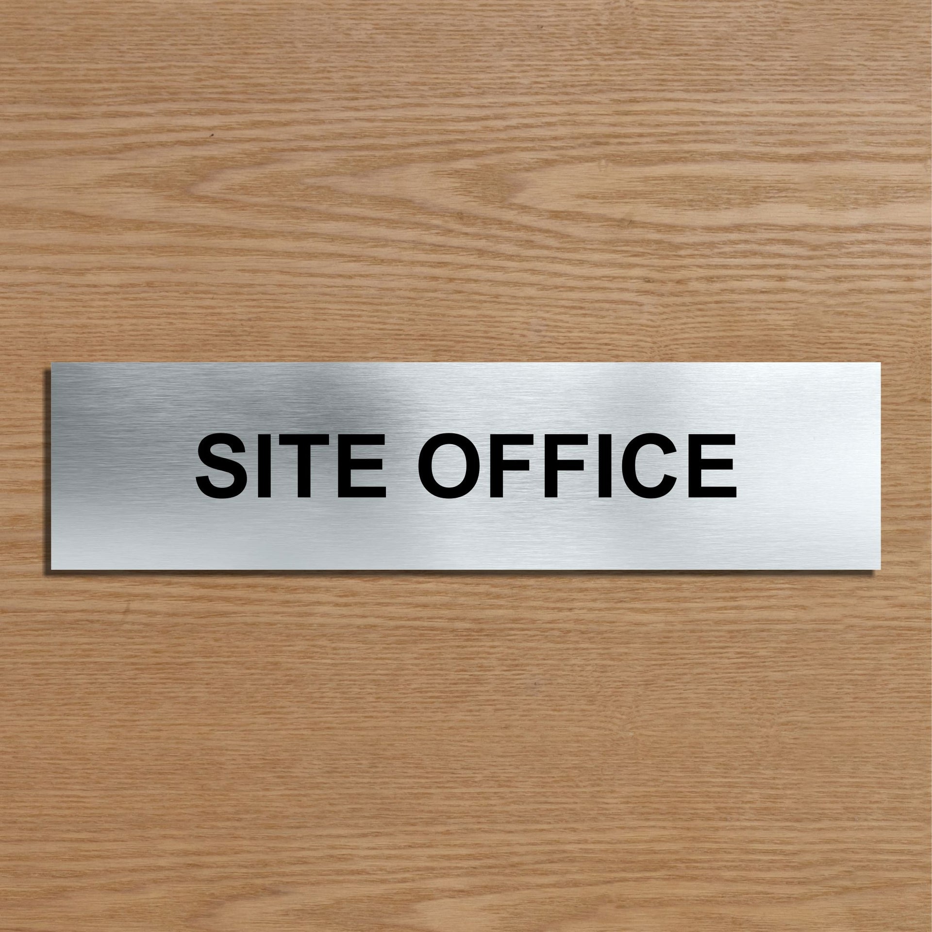 Enhance the look of your doors with our brushed aluminium Site Office Door Signs. Brushed silver aluminum door signs are known for their contemporary appeal, giving a high-end look that is both sleek as well as being practical. The distinctive brushed aluminium texture creates a modern aesthetic that is perfect for businesses or organisations aiming to convey a sense of style and professionalism. The textured metallic finish adds a touch of luxury, making brushed aluminum door signs a popular choice for any location. Manufactured by us here in the UK using a high quality 3mm brushed silver aluminium composite sheet each door sign is suitable for either internal or external use. Our door signs are precision cut to size and shape using one of our flat bed CNC routers and is then digitally printed directly to the surface using the very latest UV printing technology. This door sign is also available in a 3mm bright white aluminium composite finish. These door signs are supplied with self adhesive pads to allow for easy installation.  We also offer a range of stylish screw fixings that are designed to compliment the finish of each sign. Due to the large selection of different sign designs to avoid drill holes in the actual image or text area we do not supply these signs with any pre-drilled holes.