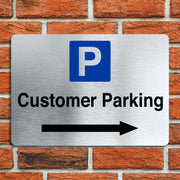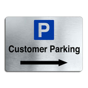 Customer Parking Sign in a Brushed Aluminium Finish with a Right Pointing Directional Arrow