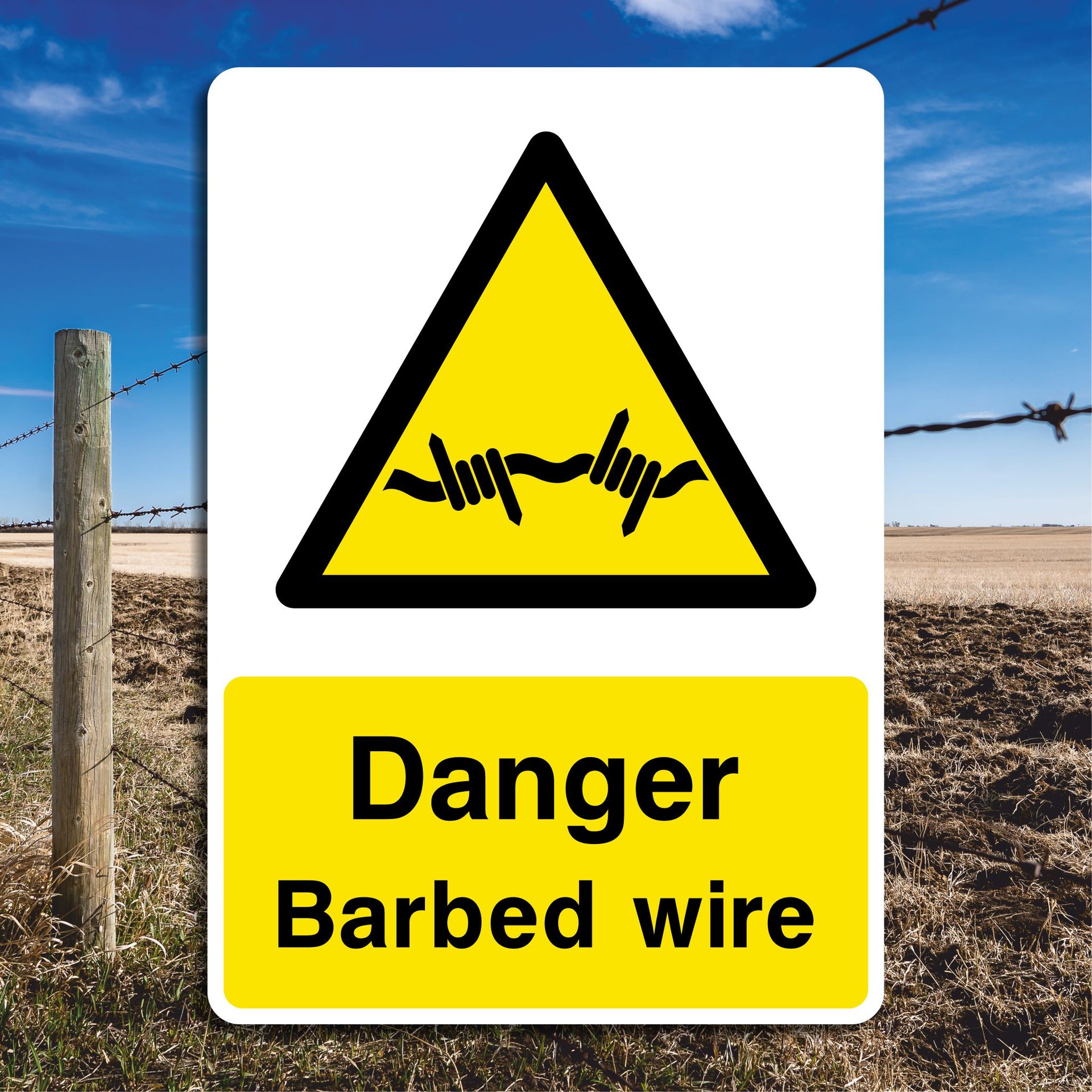 Danger Barbed Wire Hazard Warning Sign. All our safety signs are compliant with BS EN ISO 7010 where applicable.