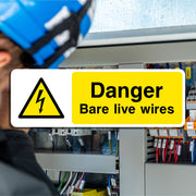 Danger Bare Live Wires Signs are used to warn people about the presence of exposed, energized electrical wires that pose a serious risk of electric shock, burns, or electrocution. The sign warns that wires are bare (uninsulated) and live (carrying current), making contact extremely dangerous. All our safety signs are compliant with BS EN ISO 7010 where applicable.