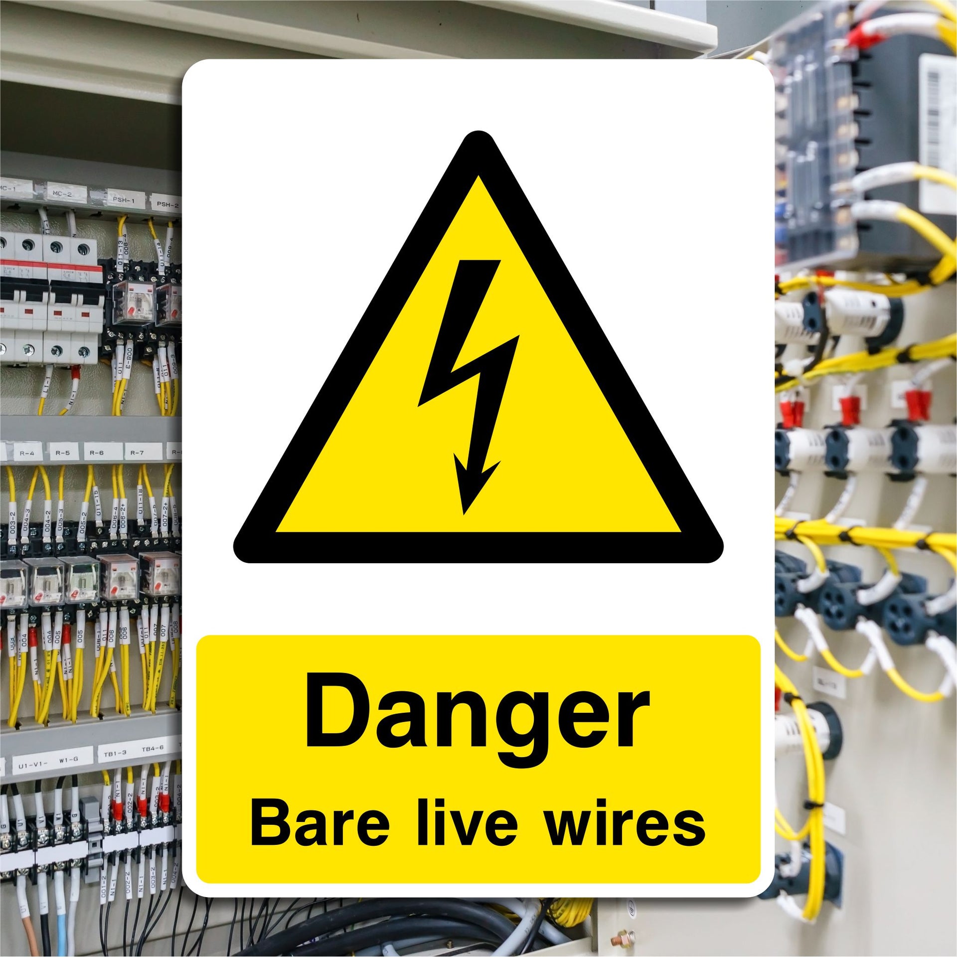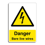 Danger Bare Live Wires Signs are used to warn people about the presence of exposed, energized electrical wires that pose a serious risk of electric shock, burns, or electrocution. The sign warns that wires are bare (uninsulated) and live (carrying current), making contact extremely dangerous. All our safety signs are compliant with BS EN ISO 7010 where applicable.