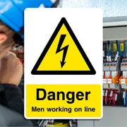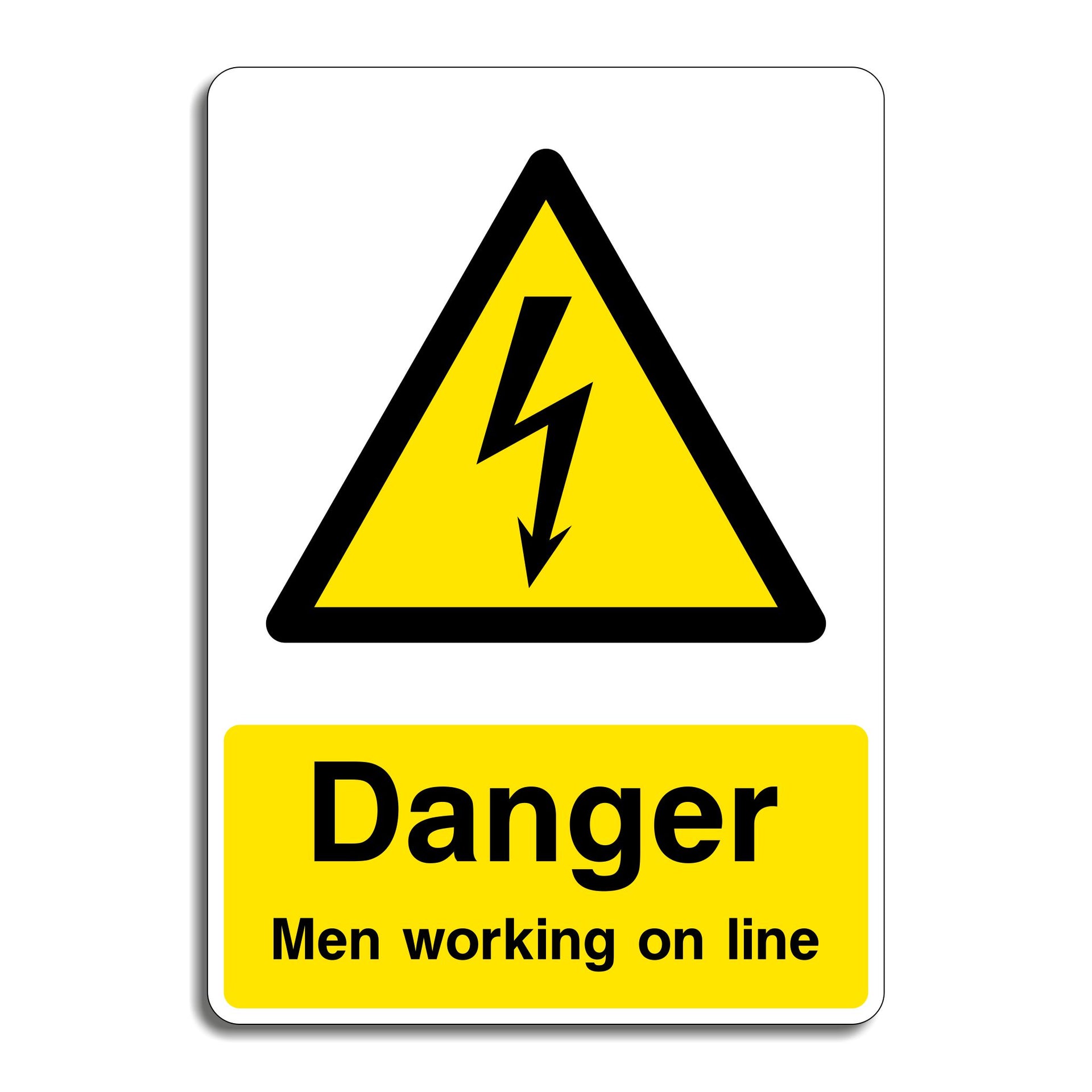 Danger Men Working On Line Signs are used to warn others, especially drivers or equipment operators, that workers are actively working on or near live electrical or communication lines, and to help prevent accidents, injuries, or fatalities. They warn vehicle operators to slow down, avoid the area, or proceed with extreme caution. All our safety signs are compliant with BS EN ISO 7010 where applicable.