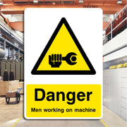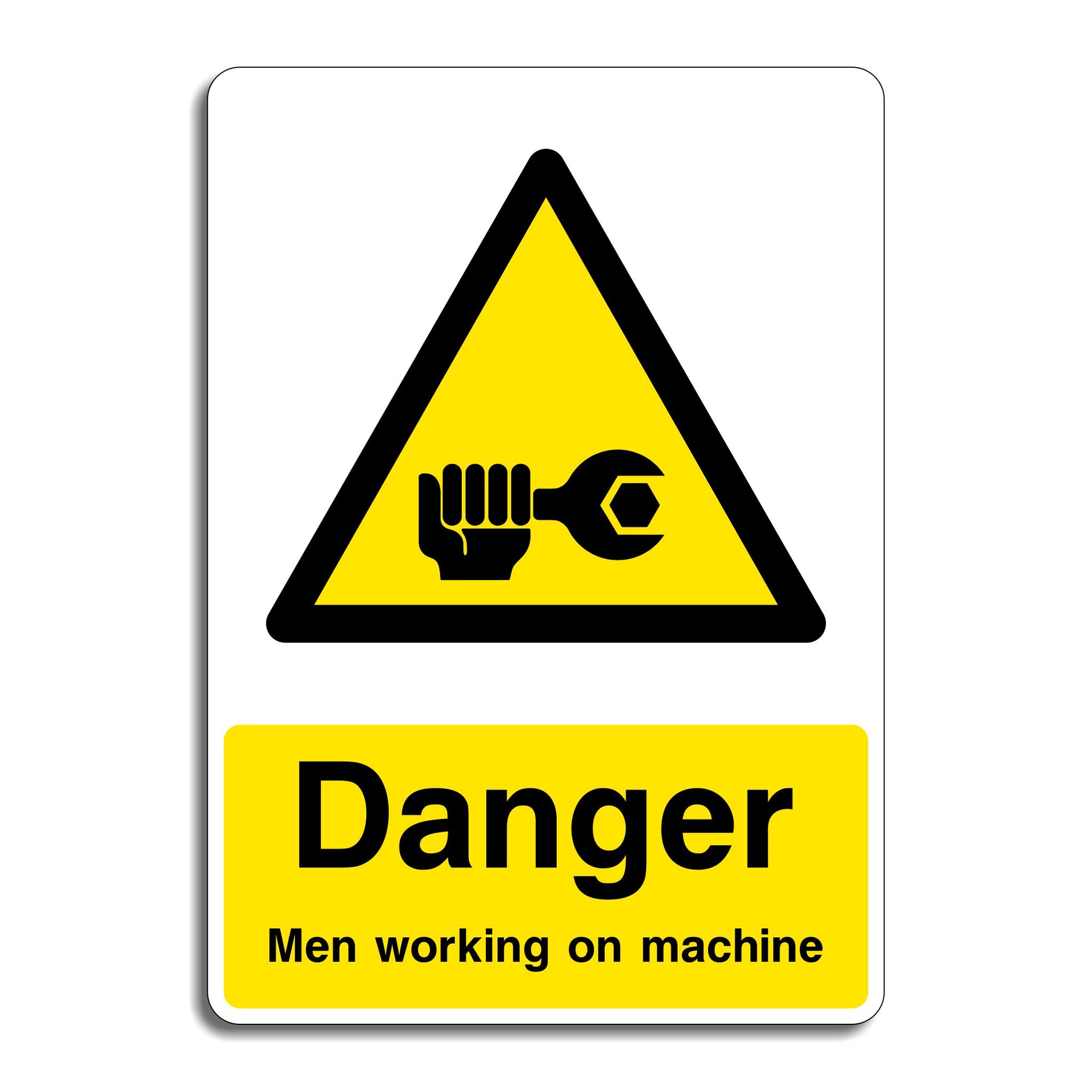 Danger Men Working on Machine Signs are used to warn and protect both workers and others in the area when maintenance, repair, or servicing is being performed on machinery. They clearly alert operators not to power on or operate the machine, which could cause serious injury or death to workers inside or near the equipment All our safety signs are compliant with BS EN ISO 7010 where applicable.