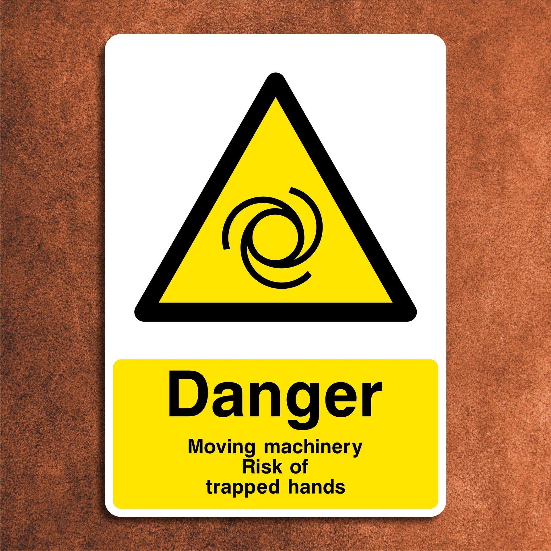Danger Moving Machinery Risk of Trapped Hands Signs are used to warn individuals about the risk of serious hand injuries from machinery with moving or rotating parts that can trap, crush, or amputate fingers and hands. This sign is typically placed near mechanical equipment such as gears, rollers, conveyors, or robotic arms where entrapment hazards exist. All our safety signs are compliant with BS EN ISO 7010 where applicable.