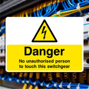 Danger No Unauthorised Person to Touch This Switchgear Signs are used to warn individuals that only trained and authorised personnel are permitted to operate or handle specific electrical switchgear. Switchgear refers to the electrical equipment used to control, protect, and isolate electrical circuits and systems, equipment that can be extremely dangerous if mishandled. All our safety signs are compliant with BS EN ISO 7010 where applicable.
