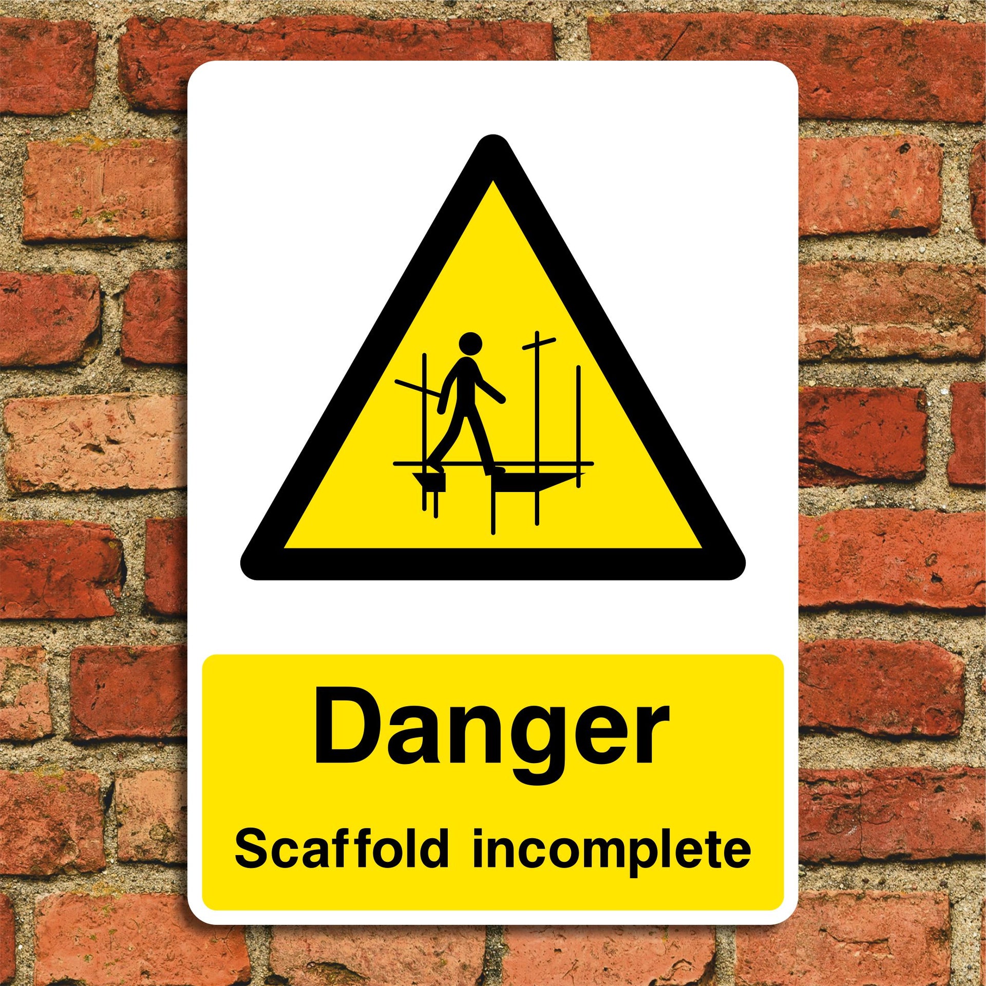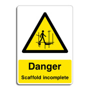 Danger Scaffold Incomplete Signs are used to warn workers and site visitors that a scaffold structure is not yet finished or safe for use. These signs are essential on construction sites, industrial projects, or any location where scaffolding is being erected, modified, or dismantled. All our safety signs are compliant with BS EN ISO 7010 where applicable.