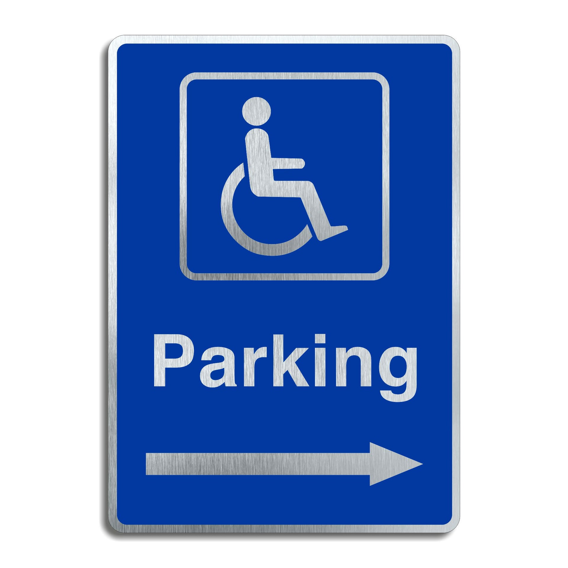 Brushed Aluminium Disabled Parking Sign with a Right Pointing Directional Arrow
