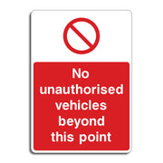 No Unauthorised Vehicles Beyond This Point Signs are used to restrict vehicle access to a specific area, allowing entry only to those with permission. They help prevent unauthorized or unknown vehicles from entering private, secure, or sensitive areas such as military bases, industrial sites, or gated communities. These signs reduce the risk of accidents by limiting traffic in areas where pedestrian activity, equipment use, or hazardous conditions are present. All our safety signs are compliant with BS EN ISO 7010 where applicable.