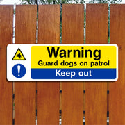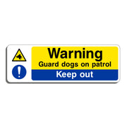 Warning Guard Dogs On Patrol Keep Out Signs are security and safety signs used to alert people that trained guard dogs are actively patrolling the area. The presence of patrolling guard dogs, combined with clear warning signage, strongly discourages trespassers, intruders, or potential criminals from attempting to enter the property. These signs support the use of guard dogs as an effective security measure to protect property, assets, and people. All our safety signs are compliant with BS EN ISO 7010 where applicable.