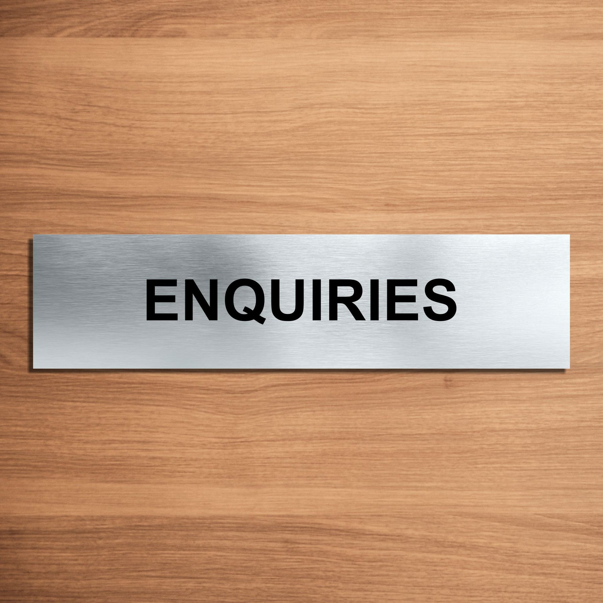 Enhance the look of your doors with our brushed aluminium Enquiries Door Signs. Brushed silver aluminum door signs are known for their contemporary appeal, giving a high-end look that is both sleek as well as being practical. The distinctive brushed aluminium texture creates a modern aesthetic that is perfect for businesses or organisations aiming to convey a sense of style and professionalism. The textured metallic finish adds a touch of luxury, making brushed aluminum door signs a popular choice for any location. Manufactured by us here in the UK using a high quality 3mm brushed silver aluminium composite sheet each door sign is suitable for either internal or external use. Our door signs are precision cut to size and shape using one of our flat bed CNC routers and is then digitally printed directly to the surface using the very latest UV printing technology. This door sign is also available in a 3mm bright white aluminium composite finish. These door signs are supplied with self adhesive pads to allow for easy installation. We also offer a range of stylish screw fixings that are designed to compliment the finish of each sign. Due to the large selection of different sign designs to avoid drill holes in the actual image or text area we do not supply these signs with any pre-drilled holes.