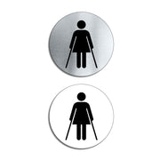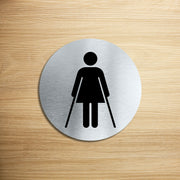 Enhance the look of your doors with our circular brushed aluminium Female Ambulant Door Signs. Brushed silver aluminum door signs are known for their contemporary appeal, giving a high-end look that is both sleek as well as being practical. The distinctive brushed aluminium texture creates a modern aesthetic that is perfect for businesses or organisations aiming to convey a sense of style and professionalism. The textured metallic finish adds a touch of luxury, making brushed aluminum door signs a popular choice for any location. Manufactured by us here in the UK using a high quality 3mm brushed silver aluminium composite sheet each door sign is suitable for either internal or external use. Our door signs are precision cut to size and shape using one of our flat bed CNC routers and is then digitally printed directly to the surface using the very latest UV printing technology. This door sign is also available in a 3mm bright white aluminium composite finish. These door signs are supplied with self adhesive pads to allow for easy installation.  We also offer a range of stylish screw fixings that are designed to compliment the finish of each sign. Due to the large selection of different sign designs to avoid drill holes in the actual image or text area we do not supply these signs with any pre-drilled holes.