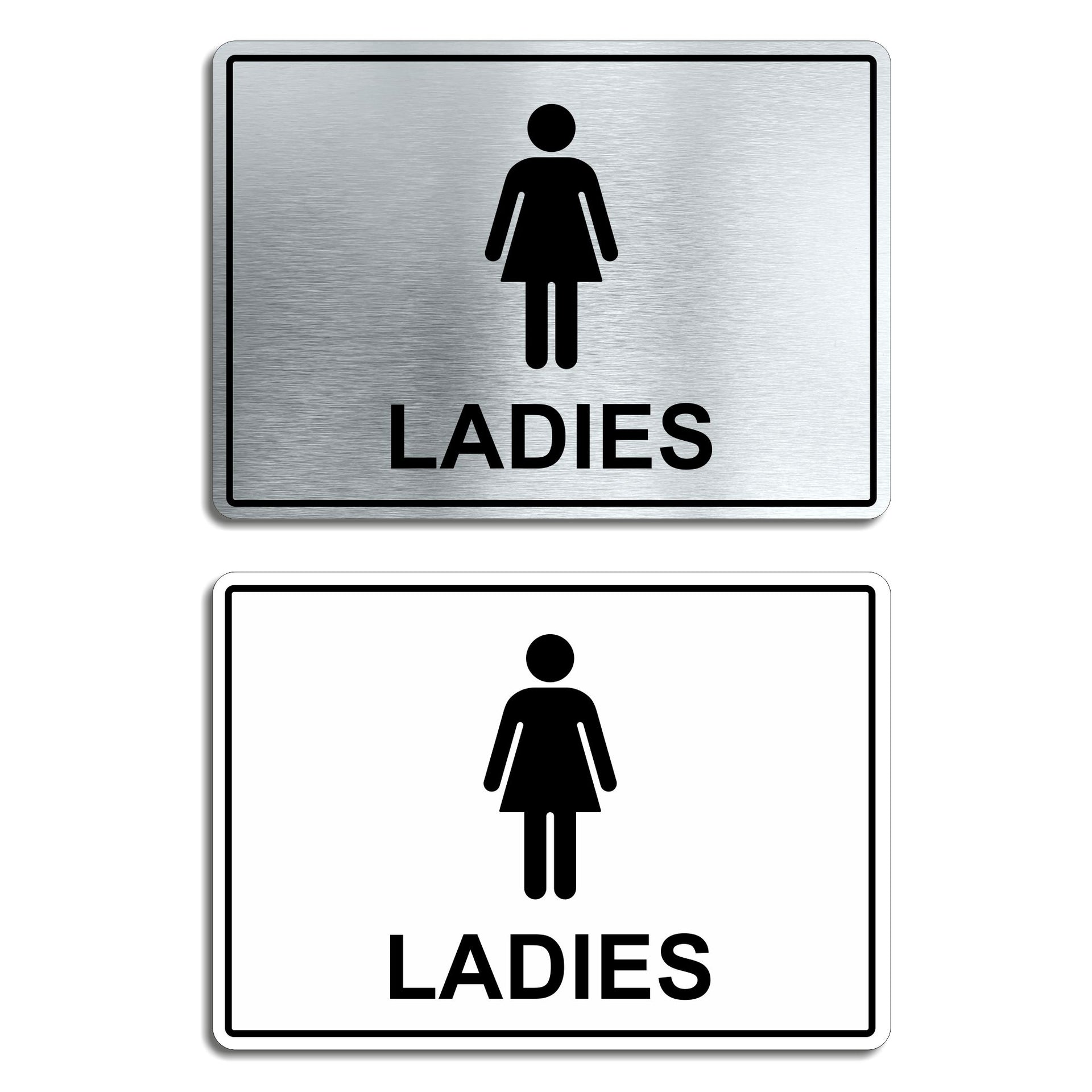 Enhance the look of your doors or walls with our brushed aluminium Ladies Toilets Signs. Brushed silver aluminum door signs are known for their prestigious look that is both sleek as well as being practical in everyday use. The distinctive brushed aluminium texture creates a modern aesthetic that is perfect for businesses or organisations aiming to convey a sense of style and professionalism. The textured metallic finish adds a touch of luxury, making brushed aluminum door signs a popular choice for any location. Manufactured by us here in the UK using a high quality 3mm brushed silver aluminium composite sheet each door sign is suitable for either internal or external use. Our door signs are precision cut to size and shape using one of our flat bed CNC routers and is then digitally printed directly to the surface using the very latest UV printing technology. This door sign is also available in a 3mm bright white aluminium composite finish. These door signs are supplied with self adhesive pads to allow for easy installation. We also offer a range of stylish screw fixings that are designed to compliment the finish of each sign. Due to the large selection of different sign designs to avoid drill holes in the actual image or text area we do not supply these signs with any pre-drilled holes.