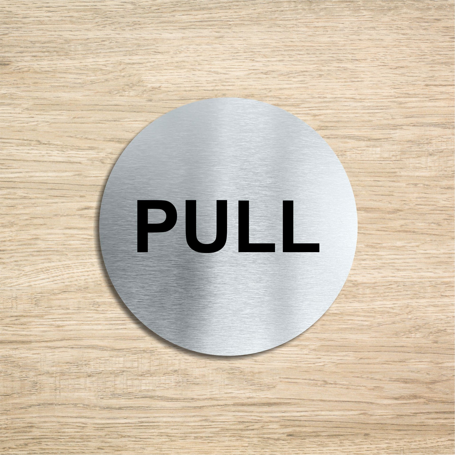 Enhance the look of your doors with our circular brushed aluminium Pull Door Signs. Brushed silver aluminum door signs are known for their contemporary appeal, giving a high-end look that is both sleek as well as being practical. The distinctive brushed aluminium texture creates a modern aesthetic that is perfect for businesses or organisations aiming to convey a sense of style and professionalism. The textured metallic finish adds a touch of luxury, making brushed aluminum door signs a popular choice for any location. Manufactured by us here in the UK using a high quality 3mm brushed silver aluminium composite sheet each door sign is suitable for either internal or external use. Our door signs are precision cut to size and shape using one of our flat bed CNC routers and is then digitally printed directly to the surface using the very latest UV printing technology. This door sign is also available in a 3mm bright white aluminium composite finish. These door signs are supplied with self adhesive pads to allow for easy installation. We also offer a range of stylish screw fixings that are designed to compliment the finish of each sign. Due to the large selection of different sign designs to avoid drill holes in the actual image or text area we do not supply these signs with any pre-drilled holes.