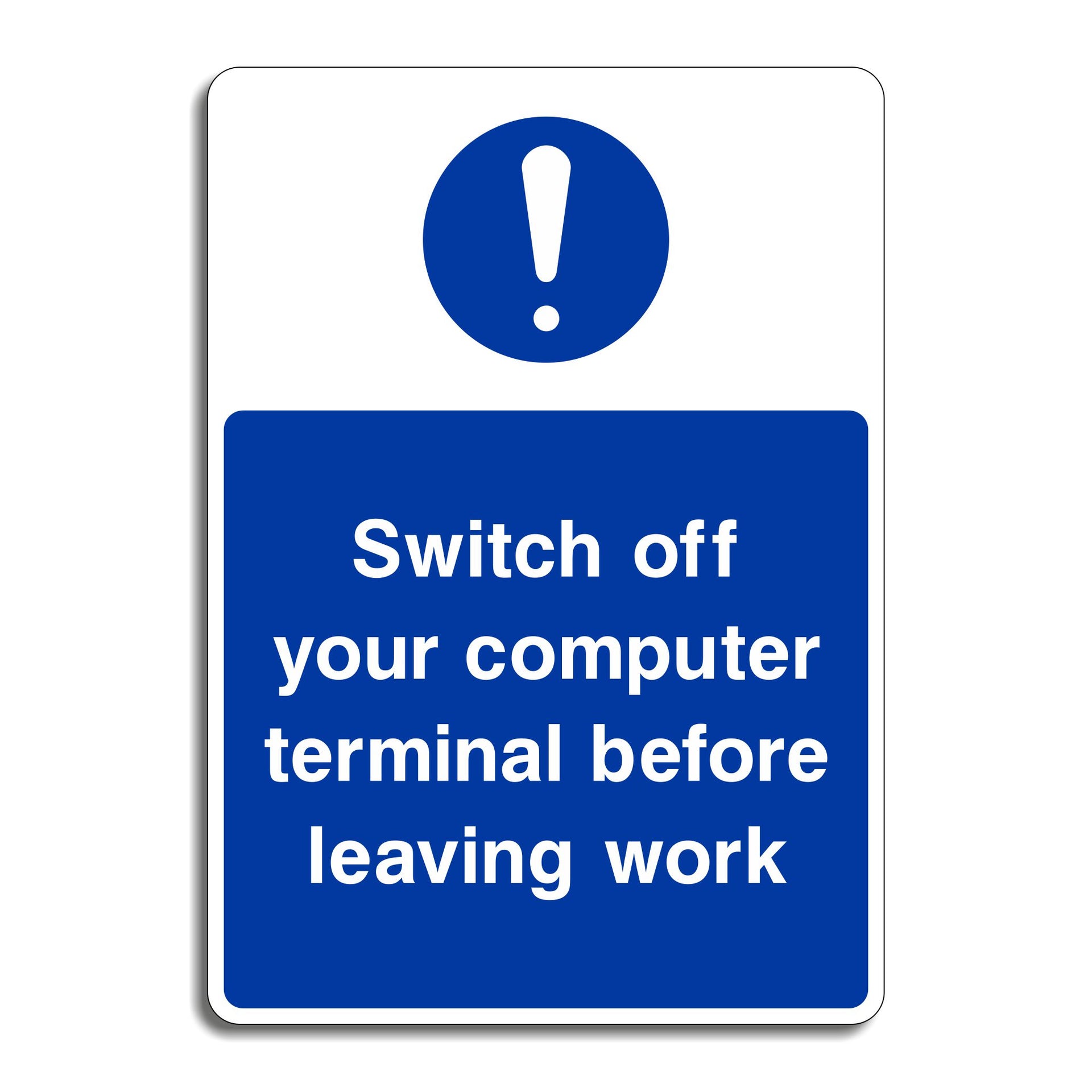 Switch Off Your Computer Terminal Before Leaving Work Signs are safety and energy-saving reminders that encourage individuals to turn off their computer terminals or workstations when they leave work or finish their tasks. These signs are commonly found in offices, workplaces, and other environments where computers are used daily. All our safety signs are compliant with BS EN ISO 7010 where applicable.
