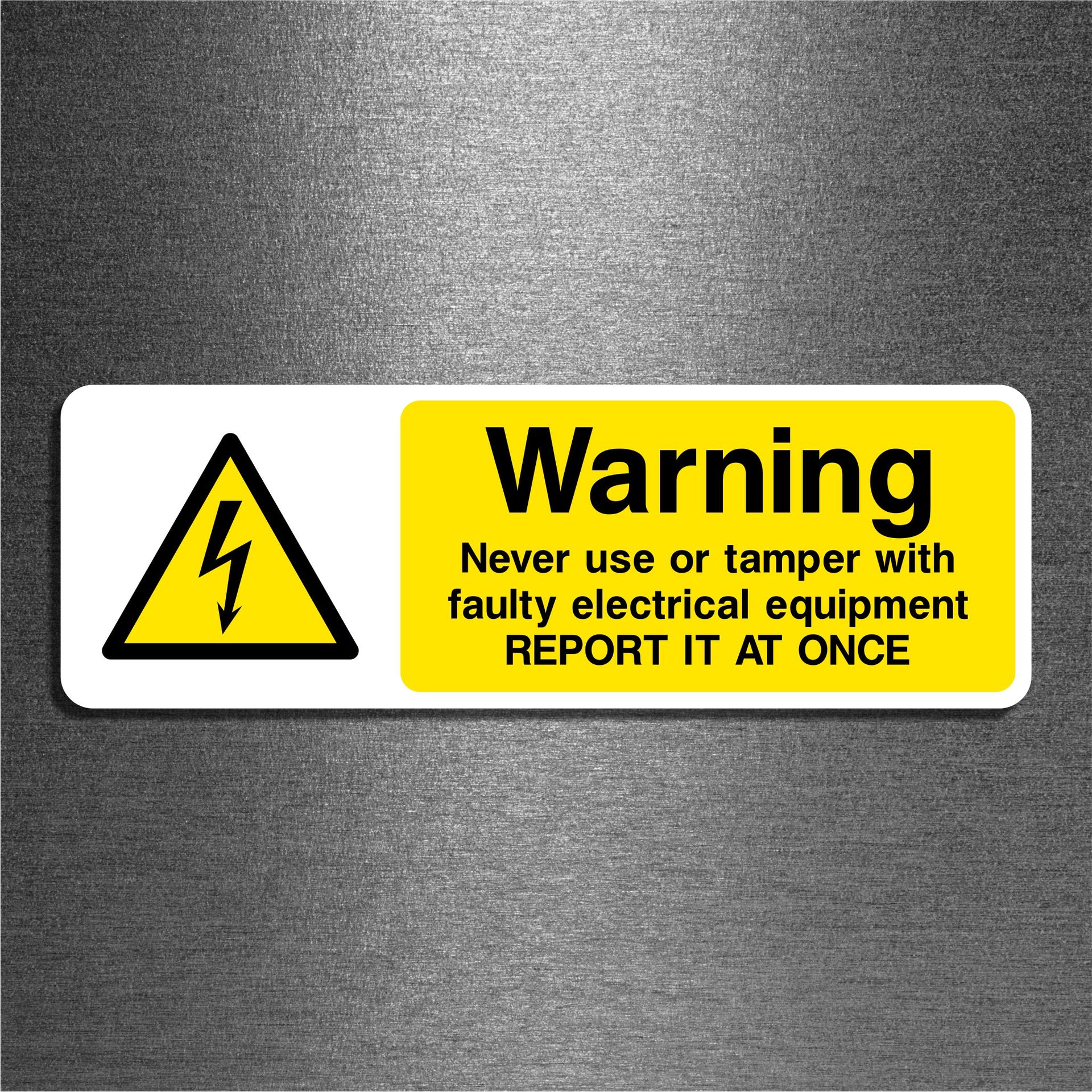 Warning Never Use or Tamper with Faulty Electrical Equipment Report It at Once Signs are designed to promote electrical safety by warning people not to use or interfere with damaged or malfunctioning electrical devices. These signs play a critical role in preventing electric shock, fires, injuries, or equipment damage in workplaces, schools, public buildings, and industrial environments. All our safety signs are compliant with BS EN ISO 7010 where applicable.