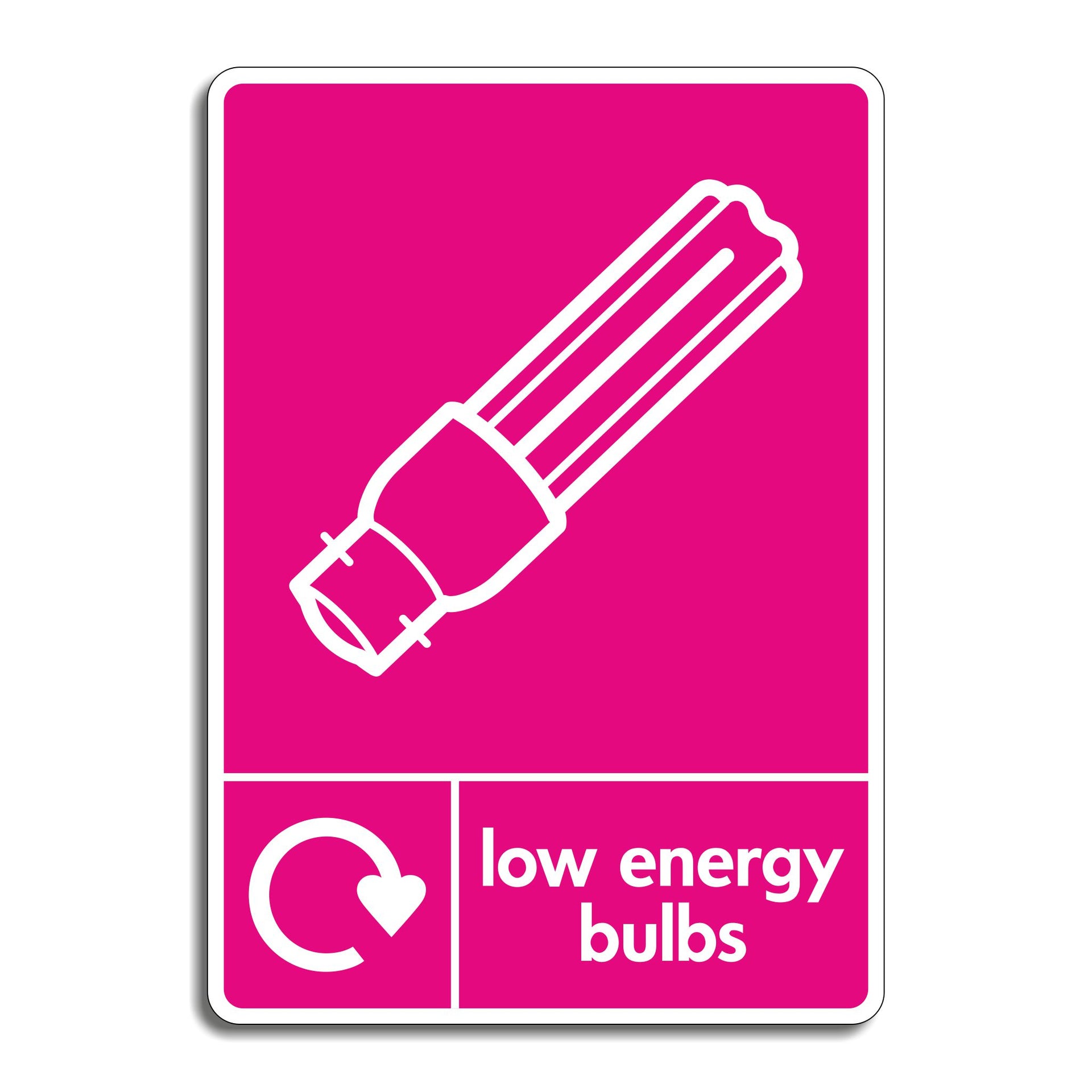 Low Energy Light Bulb Recycling Signs are used to clearly identify designated collection points for the recycling of low energy (compact fluorescent) bulbs, which contain small amounts of hazardous substances like mercury. These signs help ensure safe handling and proper disposal to prevent environmental contamination and health risks associated with broken bulbs. Use this sign to support the Waste and Resources Action Programme (Wrap) All our safety signs are compliant with BS EN ISO 7010 where applicable.
