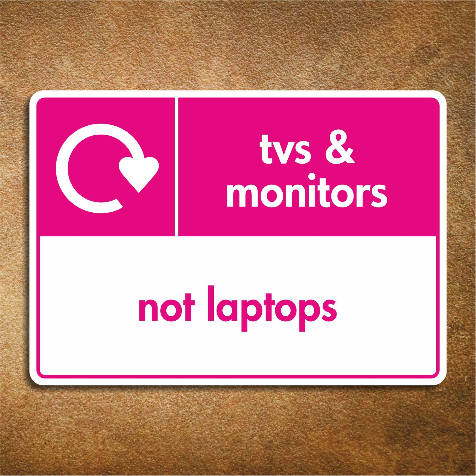 TVs & Monitors Recycling Not Laptops Signs are used to clearly indicate that a specific recycling point is intended only for televisions and computer monitors, which often require special handling due to their size, components, and potential hazardous materials. By stating "Not Laptops," the sign helps prevent the incorrect disposal of smaller electronics that need to be processed through a different recycling stream. All our safety signs are compliant with BS EN ISO 7010 where applicable.