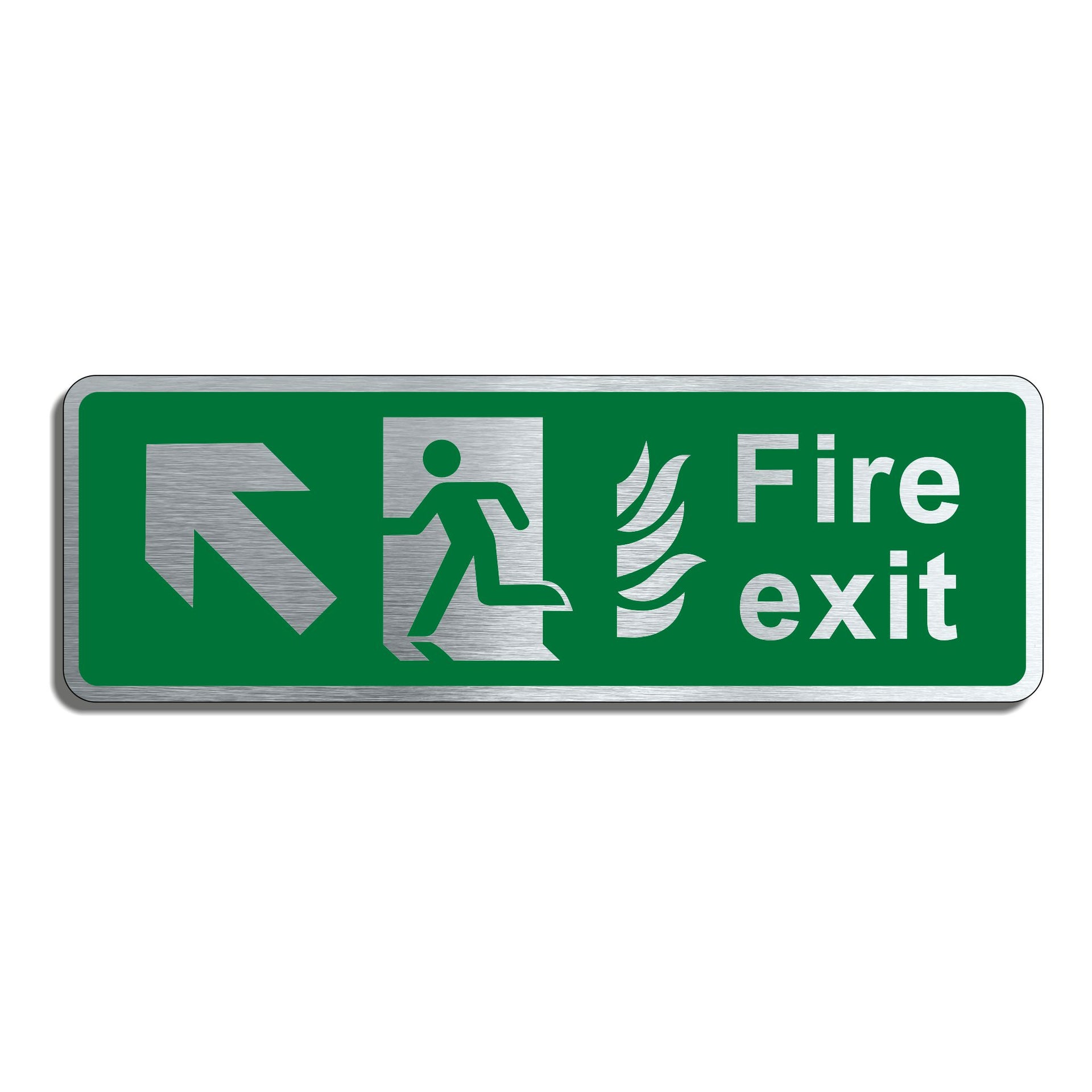 Brushed Silver Fire Exit Signs with a Forward Left Arrow are intended to clearly indicate the direction toward a fire exit, with the added specification that the exit is located toward the top left of the area or corridor. These signs play a critical role in guiding people to safety during an emergency, such as a fire, by directing them to the nearest exit in the most efficient way possible. All our safety signs are compliant with BS EN ISO 7010 where applicable.