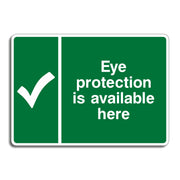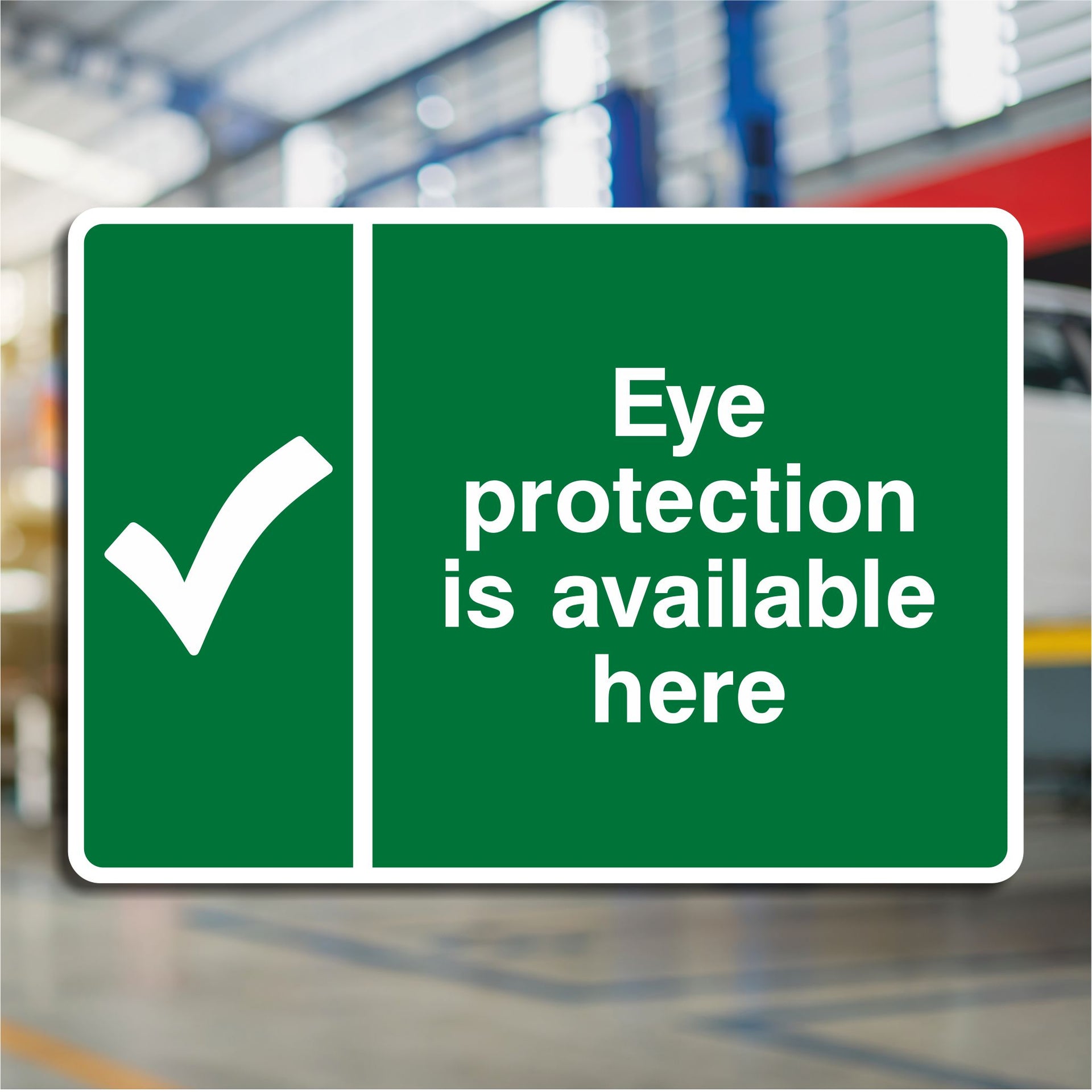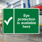 Eye Protection Is Available Here Signs are safety signs used to indicate the location where eye protection equipment, such as safety goggles, face shields, or protective glasses, can be obtained. These signs are commonly displayed in environments where there’s a risk of eye injury, including laboratories, workshops, construction sites, and manufacturing facilities. All our safety signs are compliant with BS EN ISO 7010 where applicable.