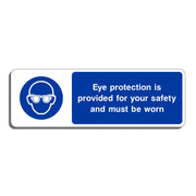 Eye Protection Is Provided for Your Safety and Must Be Worn Signs are mandatory safety notices that inform workers, visitors, or operators that eye protection is available and must be worn to protect against hazards in the area. These signs are commonly found in industrial sites, laboratories, construction zones, and workshops where there’s a risk of eye injury. All our safety signs are compliant with BS EN ISO 7010 where applicable.