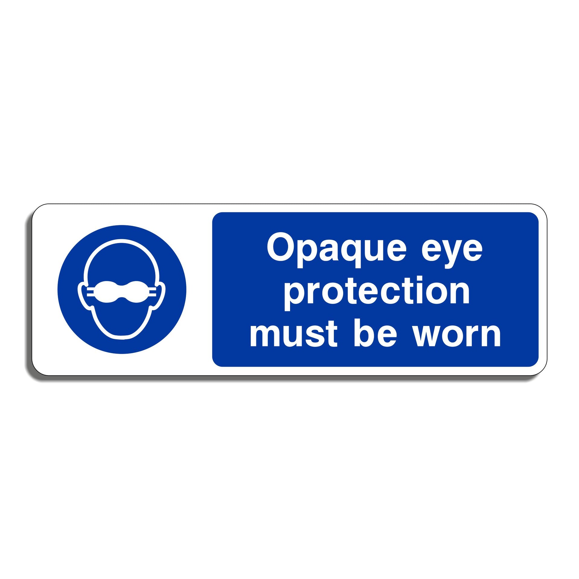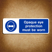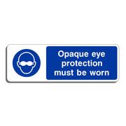Opaque Eye Wear Must Be Worn Signs are mandatory safety signs that instruct individuals to wear opaque eye protection (such as safety goggles, face shields, or visor-type eye protection) in environments where there is a risk of eye injury, especially when dealing with hazardous materials, chemicals, or potentially dangerous machinery. These signs are typically found in areas where eye protection needs to be more robust than standard clear glasses due to risks such as chemical splashes, flying debris, or intense light exposure. All our safety signs are compliant with BS EN ISO 7010 where applicable.