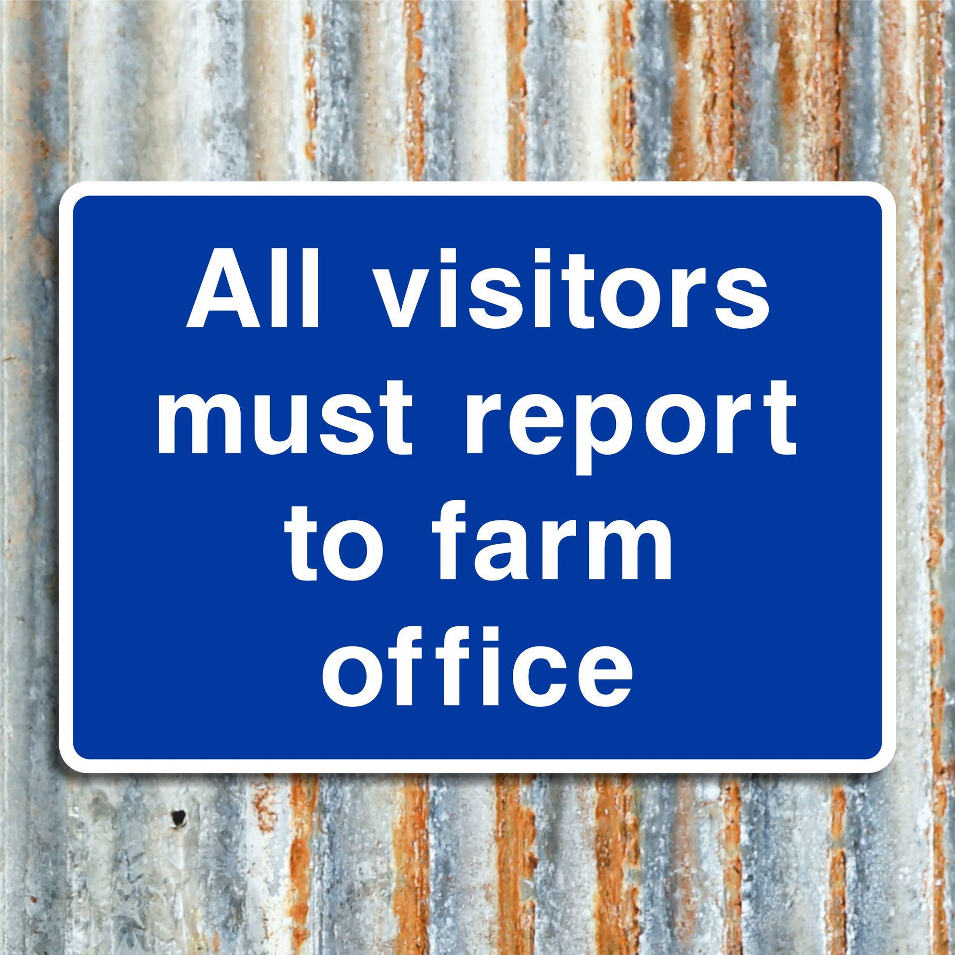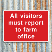 All Visitors Must Report to Farm Office Signs are used to instruct anyone entering the farm property, such as delivery drivers, contractors, inspectors, or guests, that they must check in at the farm office upon arrival. All Visitors Must Report to Farm Office Signs helps the farm keep track of who is on the property at all times, reducing the risk of trespassing or unauthorized access. All our safety signs are compliant with BS EN ISO 7010 where applicable.