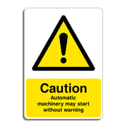 Caution Automatic Machinery May Start Without Warning signs warn people that a machine could start moving suddenly on its own, even if no one is operating it at that moment. These signs are important because they Alert people to stay clear of the machinery at all times. Prevent accidents like being struck, caught, or injured by unexpected movement. Remind workers to be cautious when servicing, inspecting, or working near the equipment. Help meet health and safety regulations that require warnings about automatic equipment. and reduce liability by showing the company has warned of possible hazard. All our safety signs are compliant with BS EN ISO 7010 where applicable.