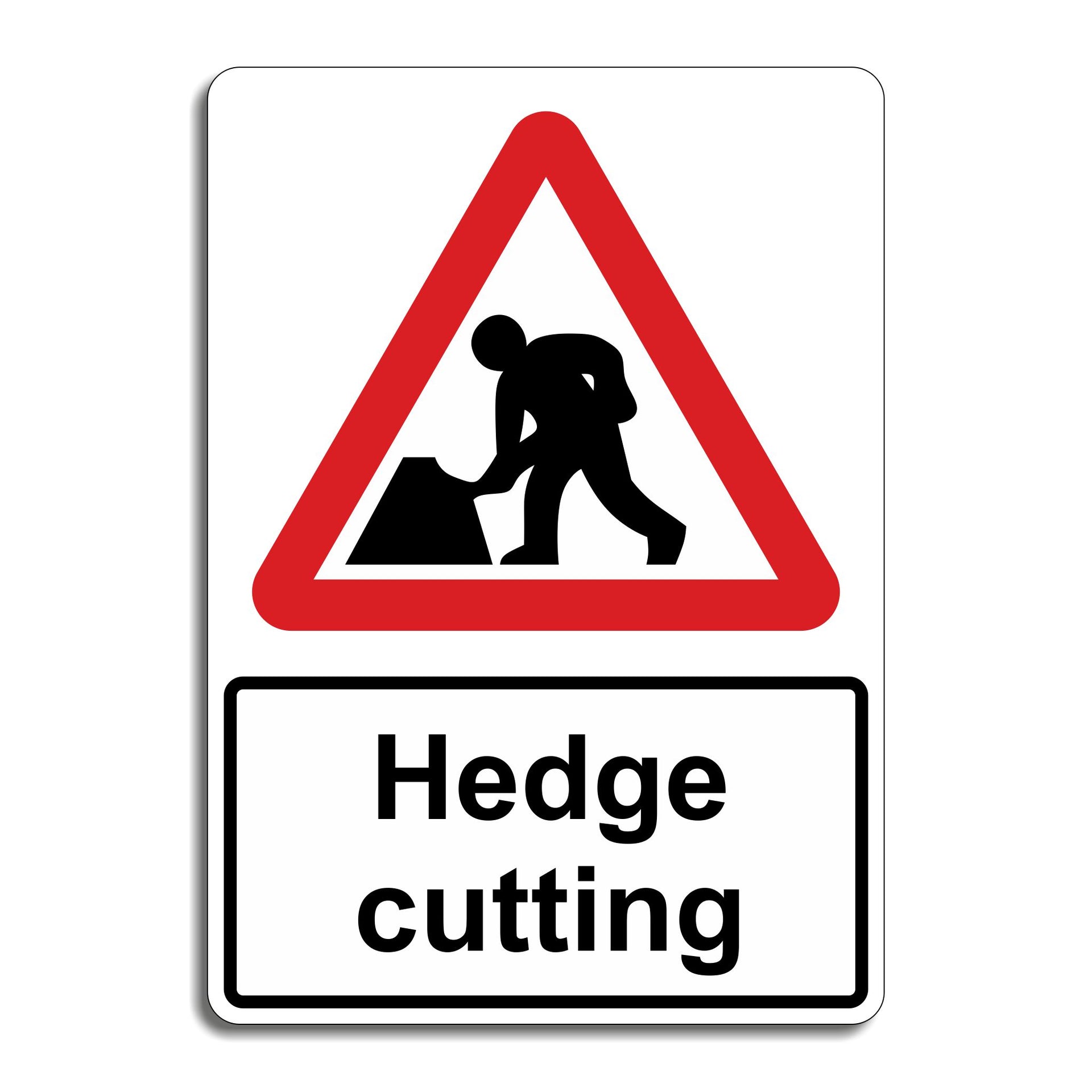 A hedge cutting sign in a red triangle is a warning sign used to alert drivers and pedestrians that hedge trimming or cutting work is happening ahead.The main purpose of this sign is to Warn people that workers, equipment, or obstacles (like cut branches) may be on or near the road. Encourage drivers to slow down and be extra cautious. Protect workers' safety while they trim or manage roadside hedges. Prevent accidents caused by sudden obstructions, narrowed roads, or reduced visibility. All our safety signs are compliant with BS EN ISO 7010 where applicable.