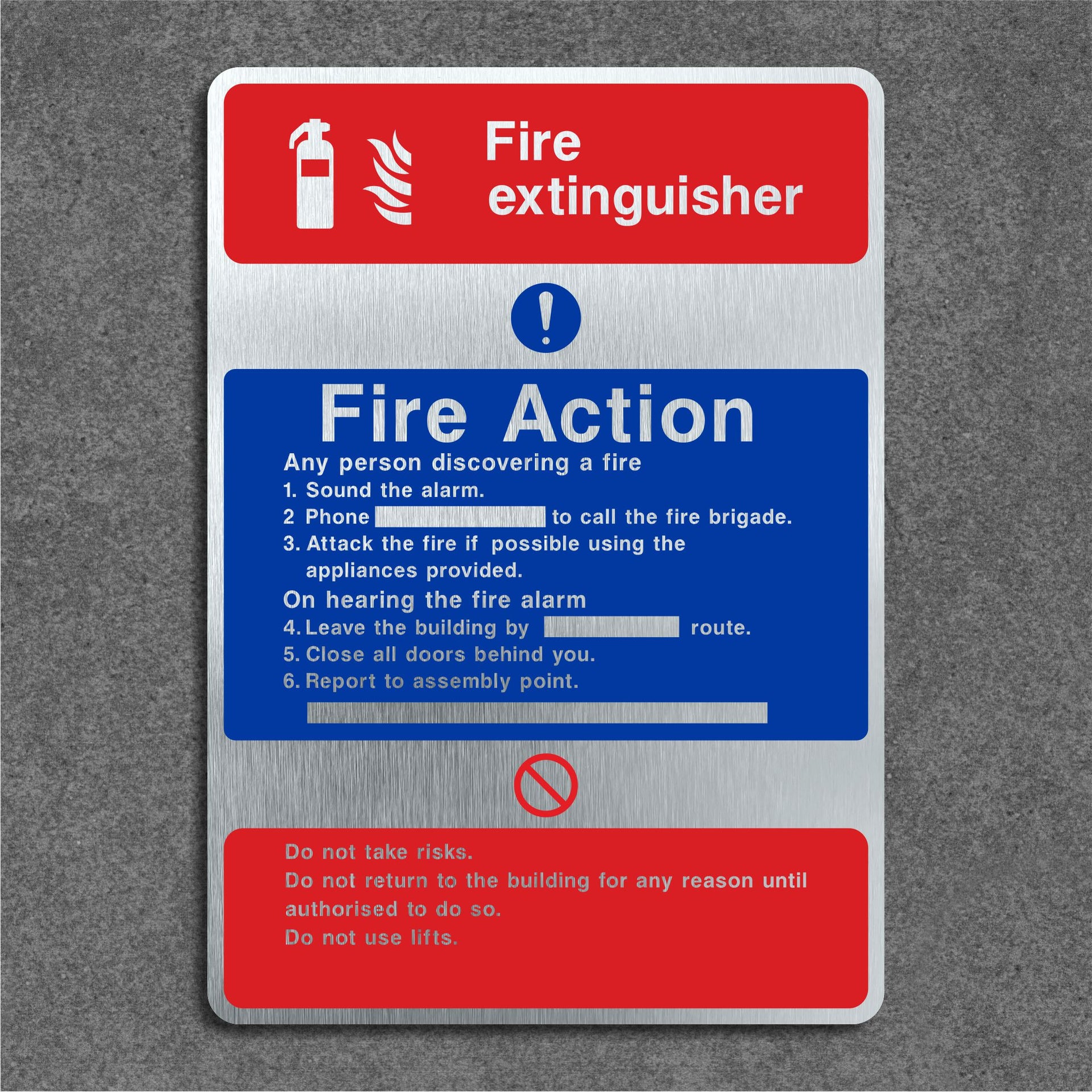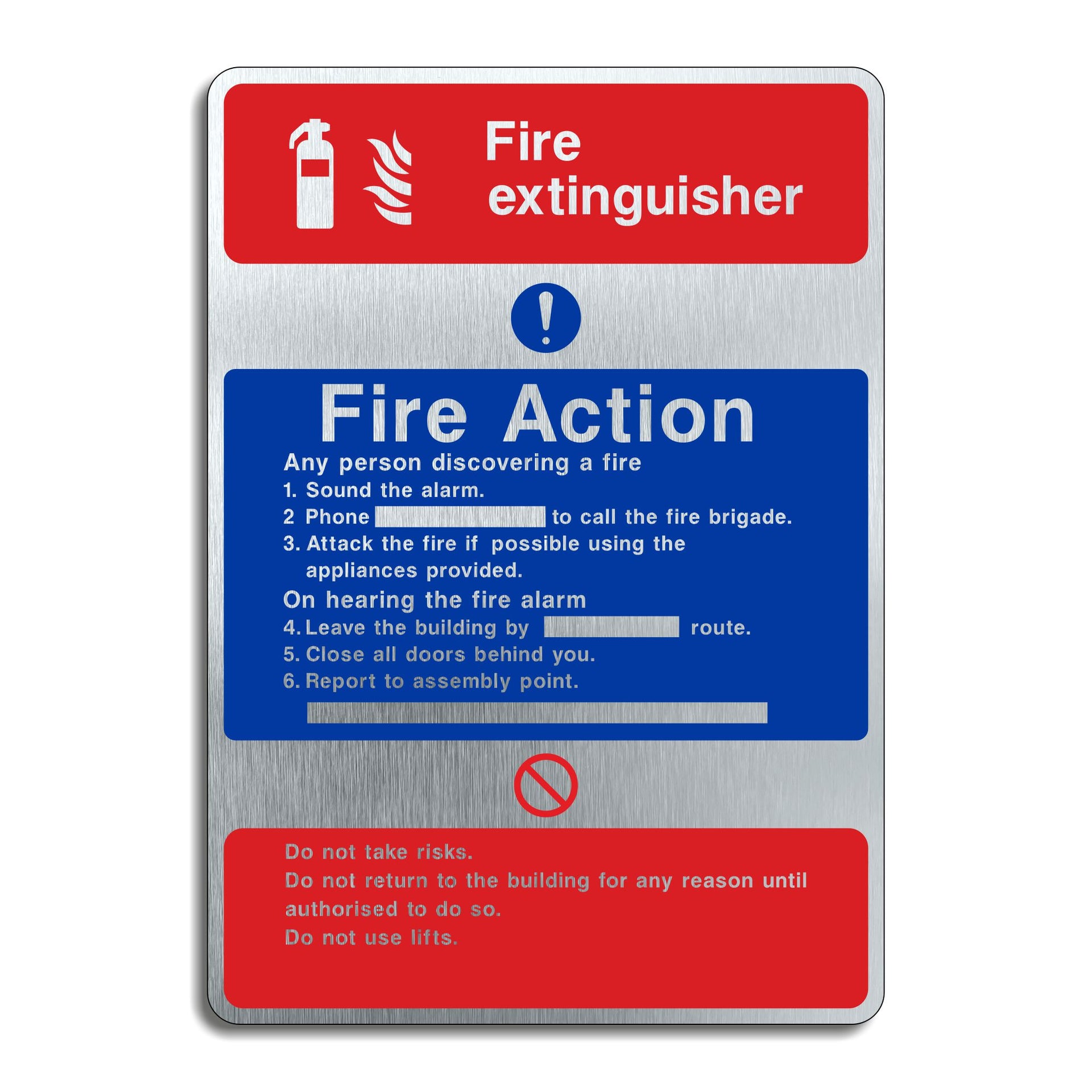 Brushed Aluminium Fire Extinguisher Fire Action Sign