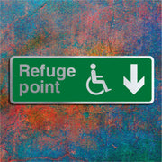 Disabled Refuge Point Signs with a Down Arrow are to direct individuals to a designated safe area, or refuge point, that is specifically designed for people with disabilities during an emergency. These signs help people who may have mobility issues or other impairments find a safe location where they can wait for assistance or be evacuated in the event of an emergency, such as a fire or building evacuation. The right arrow indicates the direction to reach this area. All our safety signs are compliant with BS EN ISO 7010 where applicable.