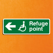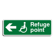 Disabled Refuge Point Sign with a Left Arrow are to direct individuals to a designated safe area, or refuge point, that is specifically designed for people with disabilities during an emergency. These signs help people who may have mobility issues or other impairments find a safe location where they can wait for assistance or be evacuated in the event of an emergency, such as a fire or building evacuation. The left arrow indicates the direction to reach this area. All our safety signs are compliant with BS EN ISO 7010 where applicable.