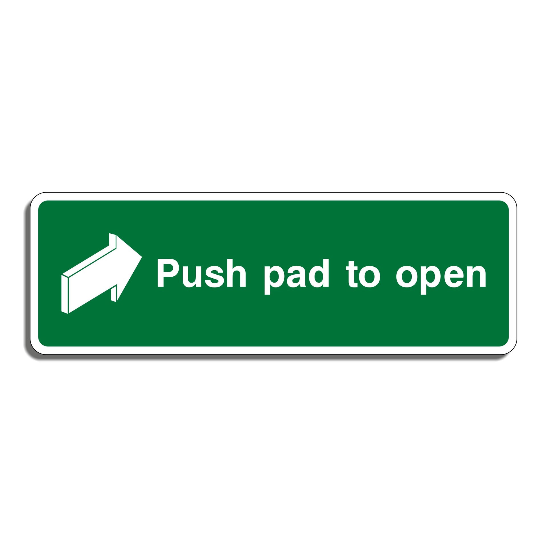 Push Pad to Open Signs are to clearly instruct individuals on how to operate a door that uses a push pad to open. Push Pad to Open Signs are commonly found on emergency exit doors or in secure areas where a quick, simple means of leaving is required. All our safety signs are compliant with BS EN ISO 7010 where applicable.