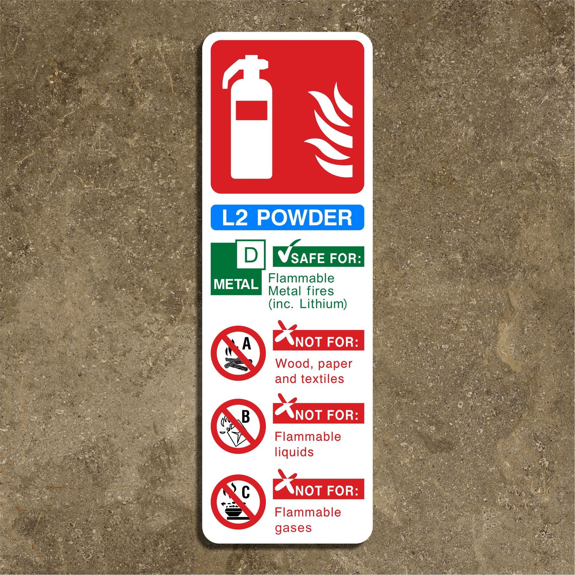 L2 powder fire extinguisher signs clearly indicate that the extinguisher is a specialist dry powder (L2) type, designed for tackling Class D fires involving flammable metals, and to outline where and how it should be used. This ensures the extinguisher is used safely, effectively, and appropriately in environments with specific fire risks. This sign identifies the extinguisher as an L2 dry powder type, a specialist extinguisher. Helps users distinguish it from standard ABC powder, foam, water, or CO₂ extinguishers. Clearly shows the extinguisher is suitable for Class D fires - Fires involving flammable metals such as lithium, magnesium, sodium, and aluminium shavings. All our safety signs are compliant with BS EN ISO 7010 where applicable.