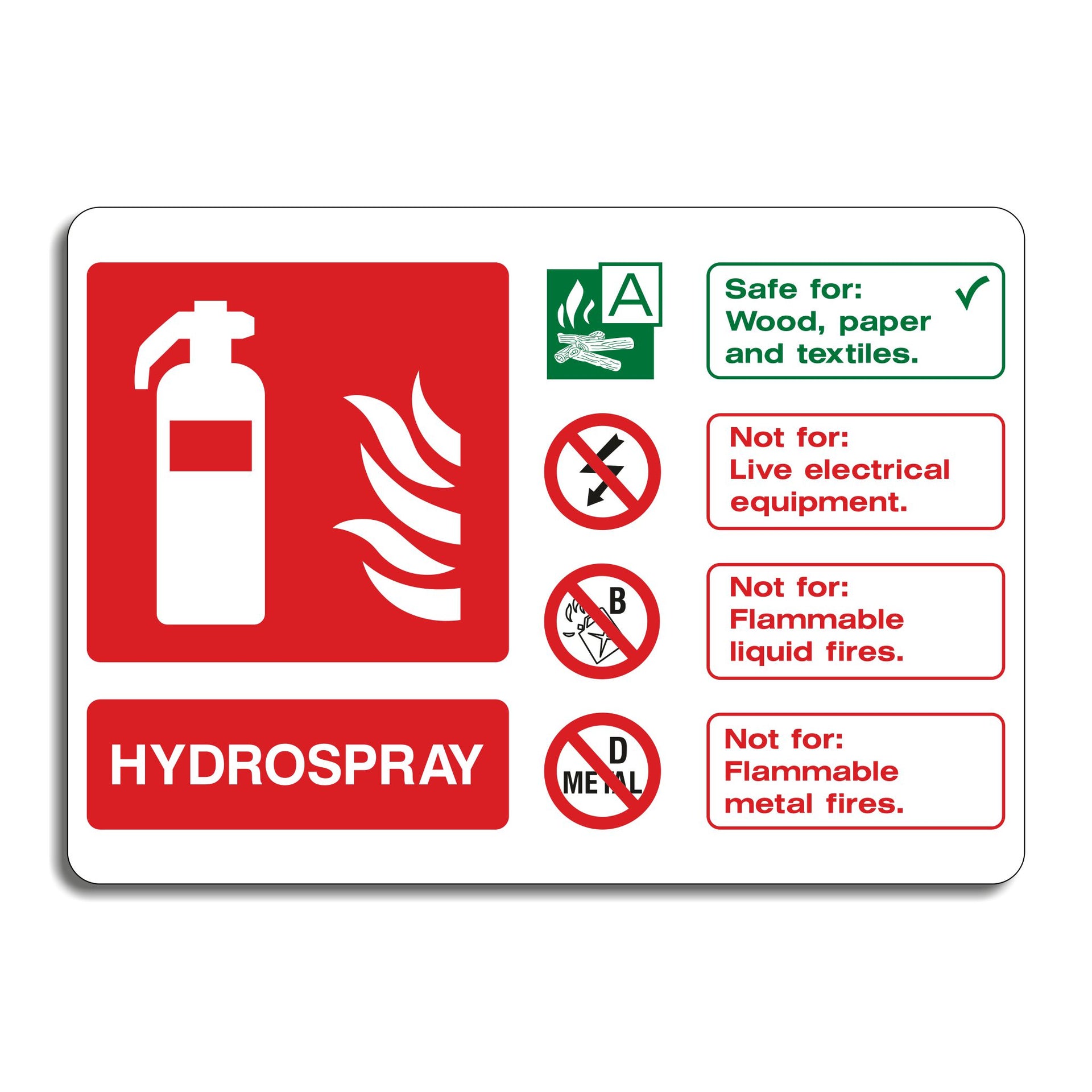 Hydrospray Fire Extinguisher Signs are used to clearly identify the location of Hydrospray fire extinguishers. Hydrospray is a brand name for a water-based fire extinguisher with additives, suitable for Class A fires (combustible materials like wood, paper, and textiles). These signs are typically displayed alongside Hydrospray extinguishers to ensure quick identification during emergencies, thereby reducing response time and enhancing safety. All our safety signs are compliant with BS EN ISO 7010 where applicable.