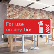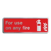 Fire Extinguisher Signs denoting For Use on Any Fire Signs are used to indicate the type of fire extinguisher that can be used on all types of fires. These signs are typically found on or near fire extinguishers that are multi-purpose or suitable for combating different classes of fires, such as Class A, B, C, D, and electrical fires. The purpose of these signs is to clearly inform people that the fire extinguisher can be used on any type of fire they might encounter. These signs are used to indicate that the fire extinguisher is suitable for use on all common types of fires. This might include Class A: Ordinary combustibles (wood, paper, cloth), Class B: Flammable liquids (gasoline, oil, paint), Class C: Electrical fires (wiring, appliances), Class D: Combustible metals (magnesium, titanium) All our safety signs are compliant with BS EN ISO 7010 where applicable.
