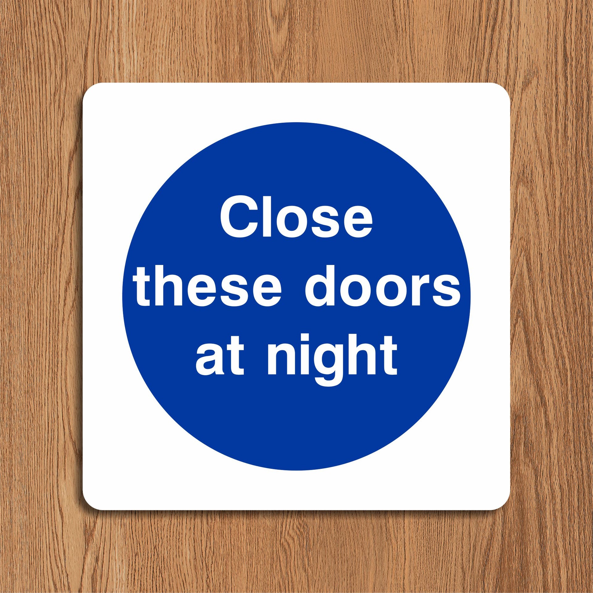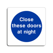 Close These Doors at Night Signs are used to remind individuals to ensure that certain doors, gates, or access points remain closed and secure during night time hours. These signs are especially important in commercial, industrial, institutional, or residential settings where the doors in question serve functions related to security, energy efficiency, and safety. All our safety signs are compliant with BS EN ISO 7010 where applicable.