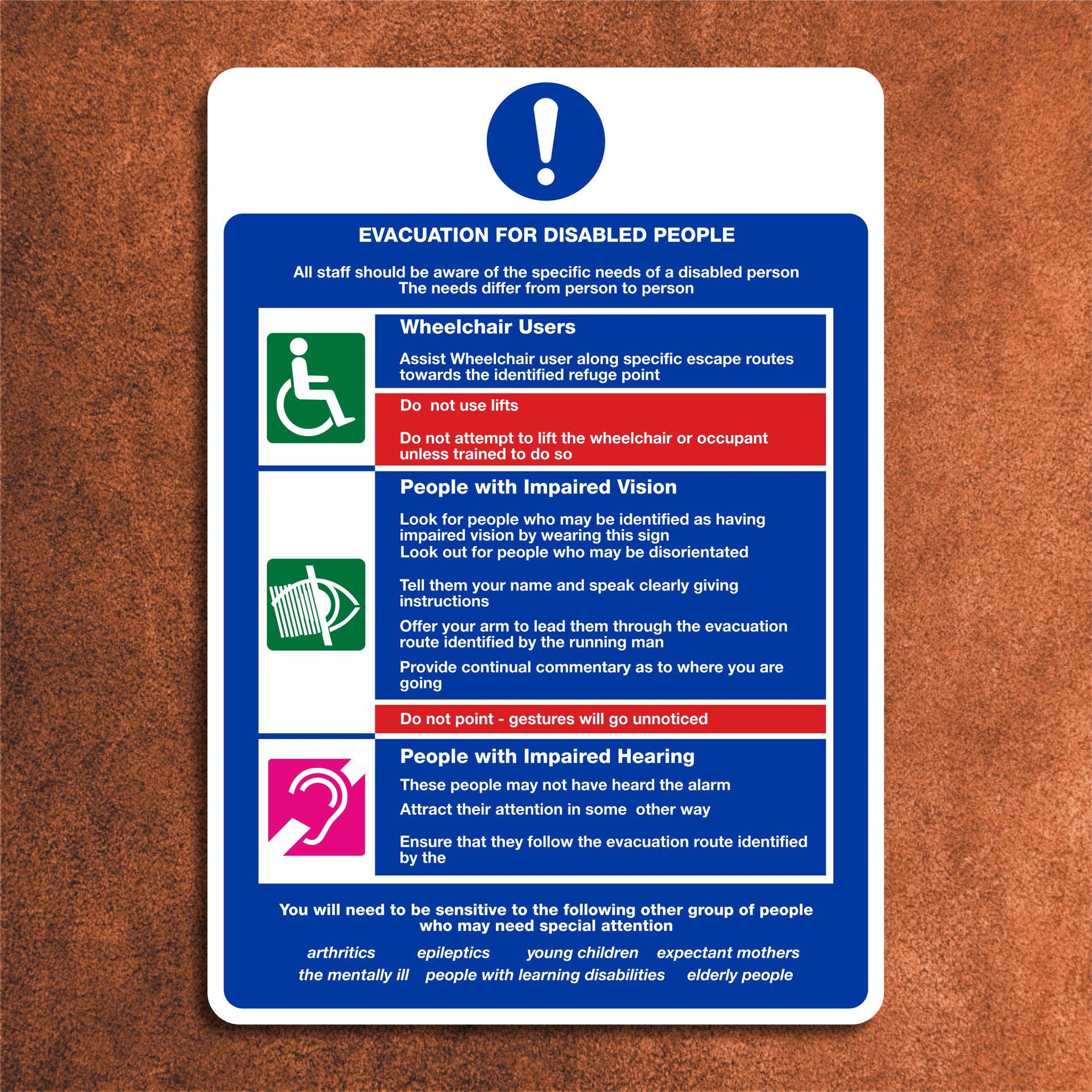 Evacuation for Disabled People Multi-Message Signs are to provide clear, accessible, and detailed instructions about evacuation procedures for individuals with disabilities during an emergency. These signs convey multiple important messages that are crucial for ensuring the safety and well-being of people with disabilities in situations where an evacuation is necessary, such as fires or other emergencies. The multi-message format allows for more comprehensive information, such as where to go for safe refuge points, how to access assistance, or instructions for using accessible evacuation routes like lifts or ramps. All our safety signs are compliant with BS EN ISO 7010 where applicable.