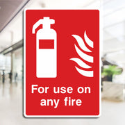 Fire extinguisher signs indicating for use on any fires are fire safety signs that indicate a particular piece of fire-fighting equipment, usually a multi-purpose fire extinguisher, that is suitable for use on multiple types of fires, including Class A (solid materials), Class B (flammable liquids), and Class C (flammable gases), and sometimes electrical fires too. All our safety signs are compliant with BS EN ISO 7010 where applicable.