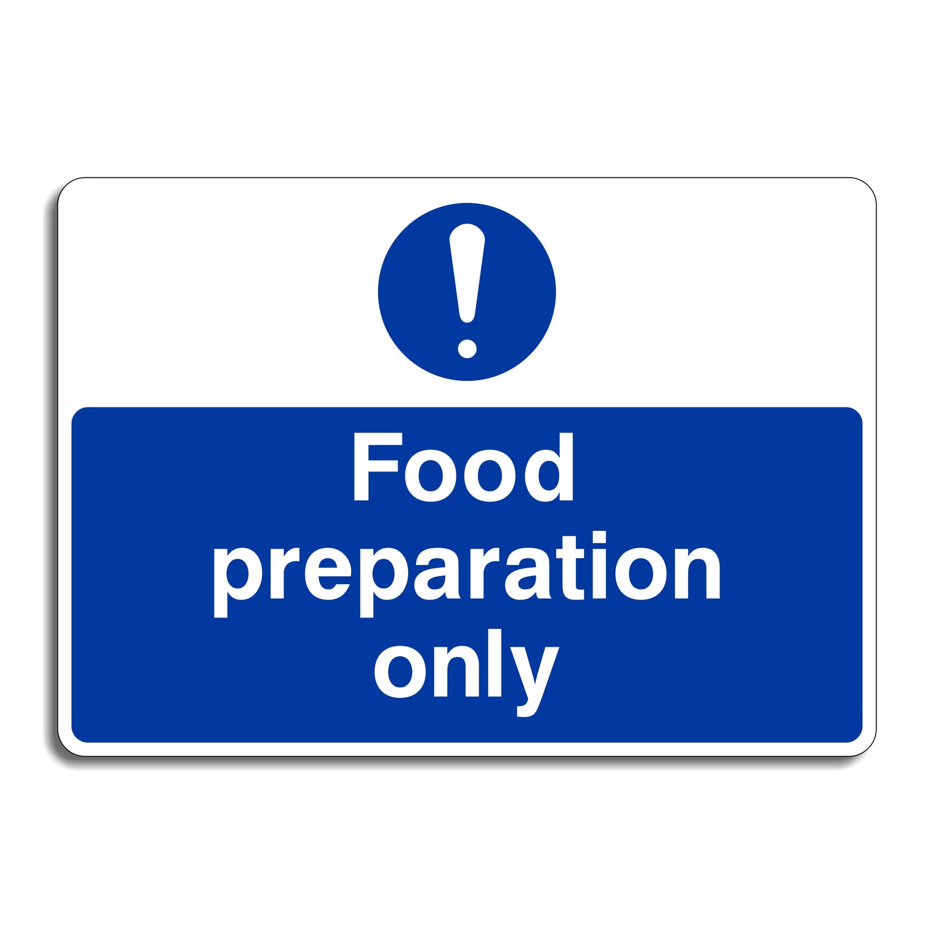 Food Preparation Only Signs are used to clearly label areas, surfaces, or equipment that are strictly designated for preparing food. Their primary purpose is to maintain hygiene, prevent cross-contamination, and ensure compliance with food safety regulations in commercial kitchens and food-handling environments. All our safety signs are compliant with BS EN ISO 7010 where applicable.