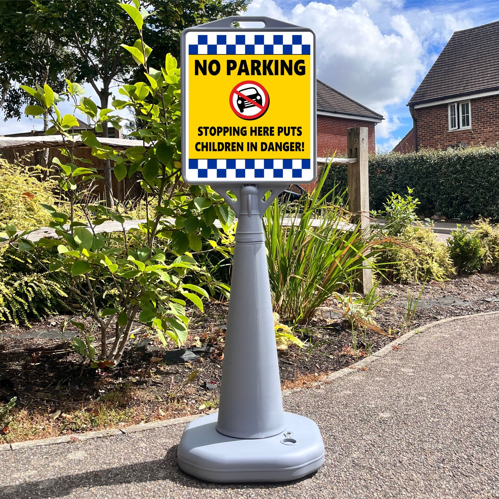 No Parking Stopping Here Puts Children In Danger Freestanding School Signs are a durable freestanding sign that has a fillable base and is perfect for you to display your important messages wherever they are needed. School hazard warning signs are positioned near schools to enhance the safety of children and other pedestrians during busy school hours. Their main purposes are to prevent cars from parking in areas where children are likely to be walking, crossing roads or getting in and out of vehicles. These signs are quick and easy to assemble with no tools required and are fully weather resistant. You can fill the base with either water or sand for added stability. These double sided school signs are 1160mm high it and have a double sided display area of 330mm x 385mm. These polyethlene freestanding signs can be used either indoors or outdoors and with no metal pieces or sharp edges are child friendly. These durable waterbase Pyramid Freestanding Signs are ideal for use as directional signs, swimming pools signs, school car park signs, no parking signs and information signs around your school.