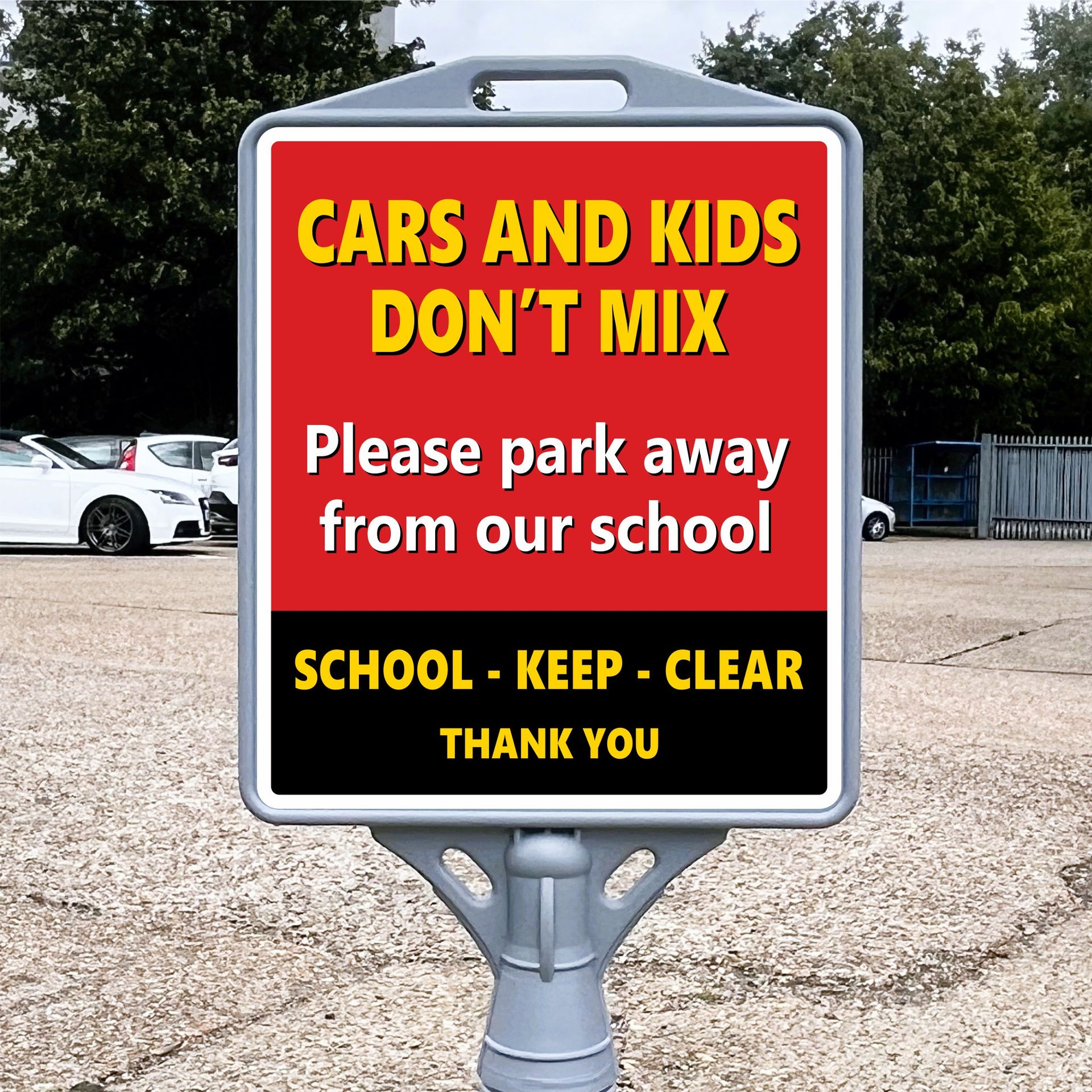 Cars and Kids Don't Mix School Signs are a durable freestanding sign that has a fillable base and is perfect for you to display your important messages wherever they are needed. School hazard warning signs are positioned near schools to enhance the safety of children and other pedestrians during busy school hours. Their main purposes are to prevent cars from parking in areas where children are likely to be walking, crossing roads or getting in and out of vehicles. These signs are quick and easy to assemble with no tools required and are fully weather resistant. You can fill the base with either water or sand for added stability. These double sided school signs are 1160mm high it and have a double sided display area of 330mm x 385mm. These polyethlene freestanding signs can be used either indoors or outdoors and with no metal pieces or sharp edges are child friendly. These durable waterbase Pyramid Freestanding Signs are ideal for use as directional signs, swimming pools signs, school car park signs, no parking signs and information signs around your school.