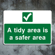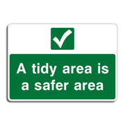 A Tidy Area is a Safer Area sign- Ensure a safer environment for staff or visitors with this sign. This sign has been designed to help reduce the risk of workplace accidents, such as slips, trips, and falls. All our safety signs are compliant with BS EN ISO 7010 where applicable.