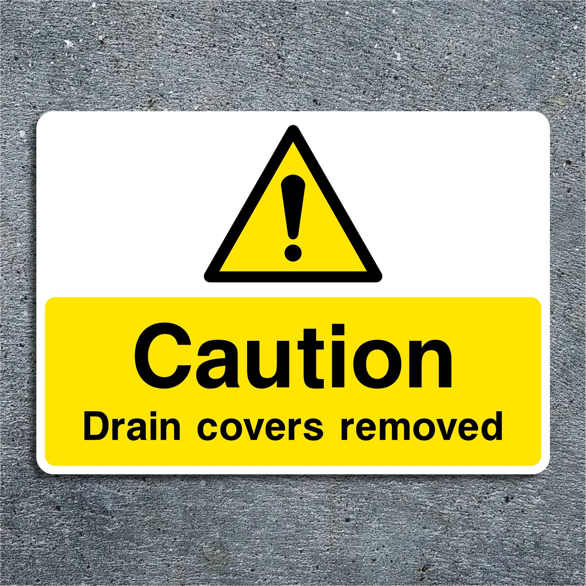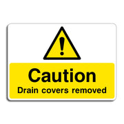 Caution Drain Covers Removed signs are used to warn pedestrians, workers, and vehicle operators that drain or manhole covers have been temporarily removed, creating an open hazard in the area. This sign is typically used during maintenance, cleaning, or inspection work involving underground utilities. All our safety signs are compliant with BS EN ISO 7010 where applicable.