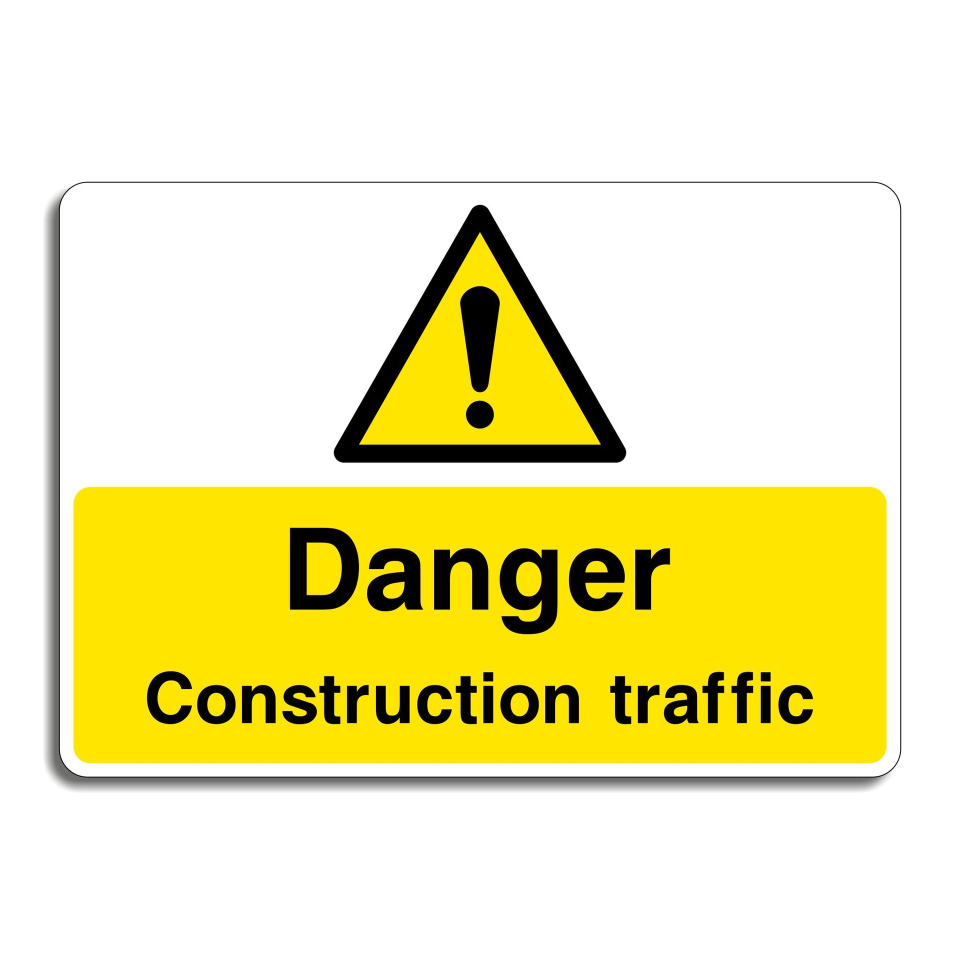 Danger Construction Traffic signs are used warn pedestrians, motorists, and other site users that construction vehicles such as dumper trucks, excavators or delivery lorries are actively moving in and out of the area. You’ll typically see this sign at the entrance to or around construction sites. All our safety signs are compliant with BS EN ISO 7010 where applicable.