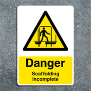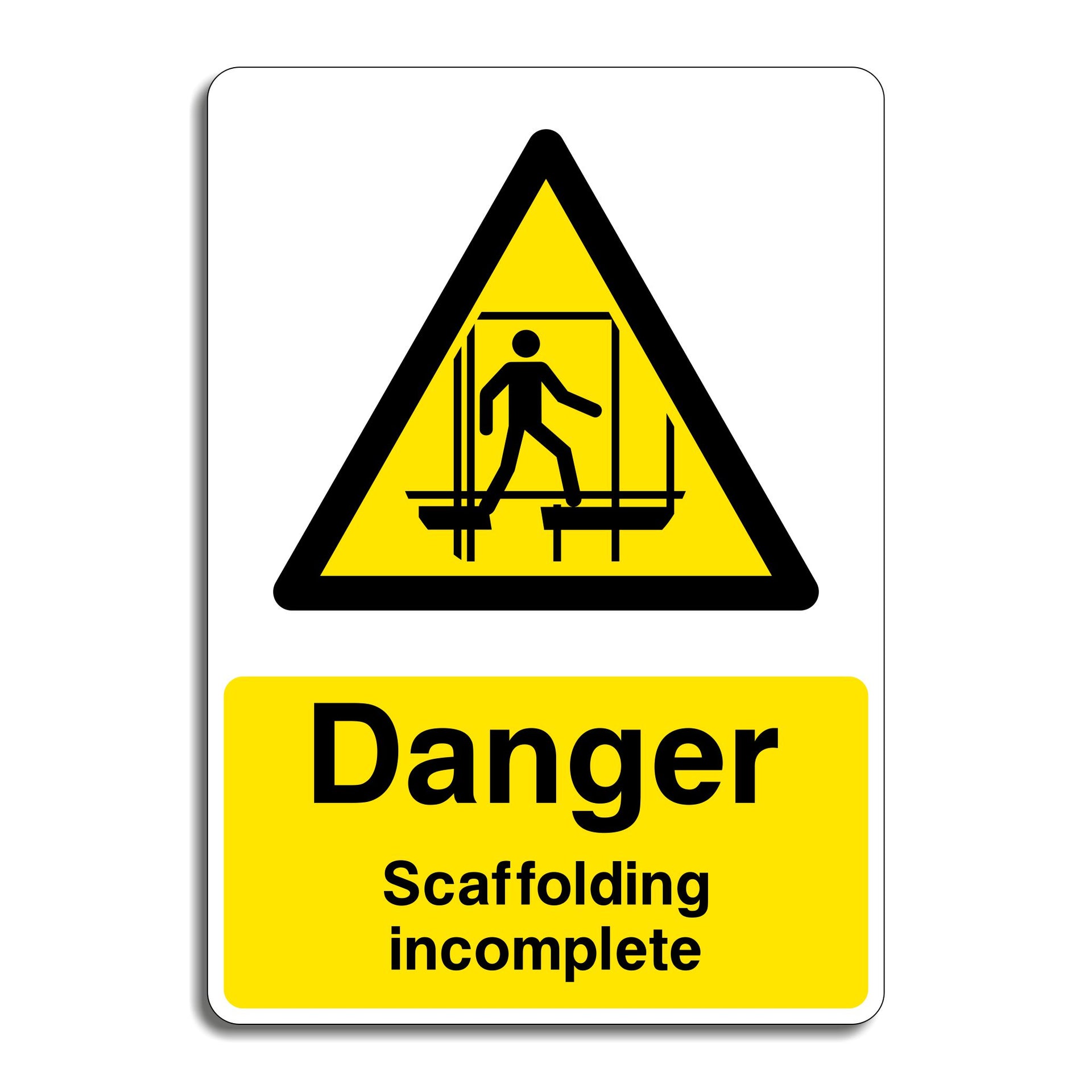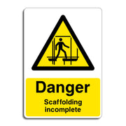 Danger Scaffolding Incomplete Hazard Warning Sign. Help to ensure the safety of your construction site with this incomplete scaffolding hazard warning sign. Featuring a vibrant yellow and bold and eye-catching pictogram and text this hazard warning sign warns individuals that there is incomplete scaffolding on your building site. All our safety signs are compliant with BS EN ISO 7010 where applicable.
