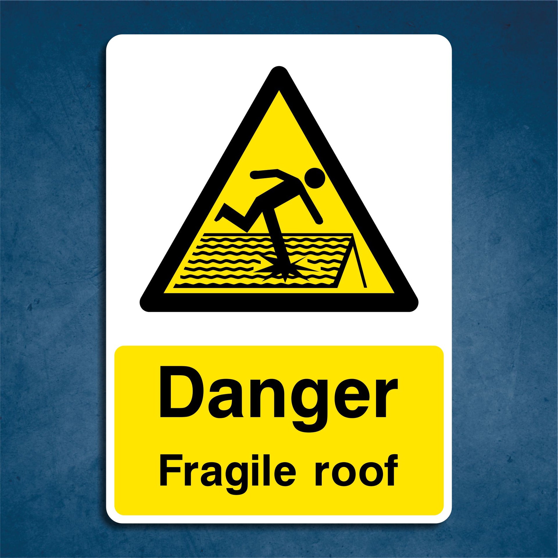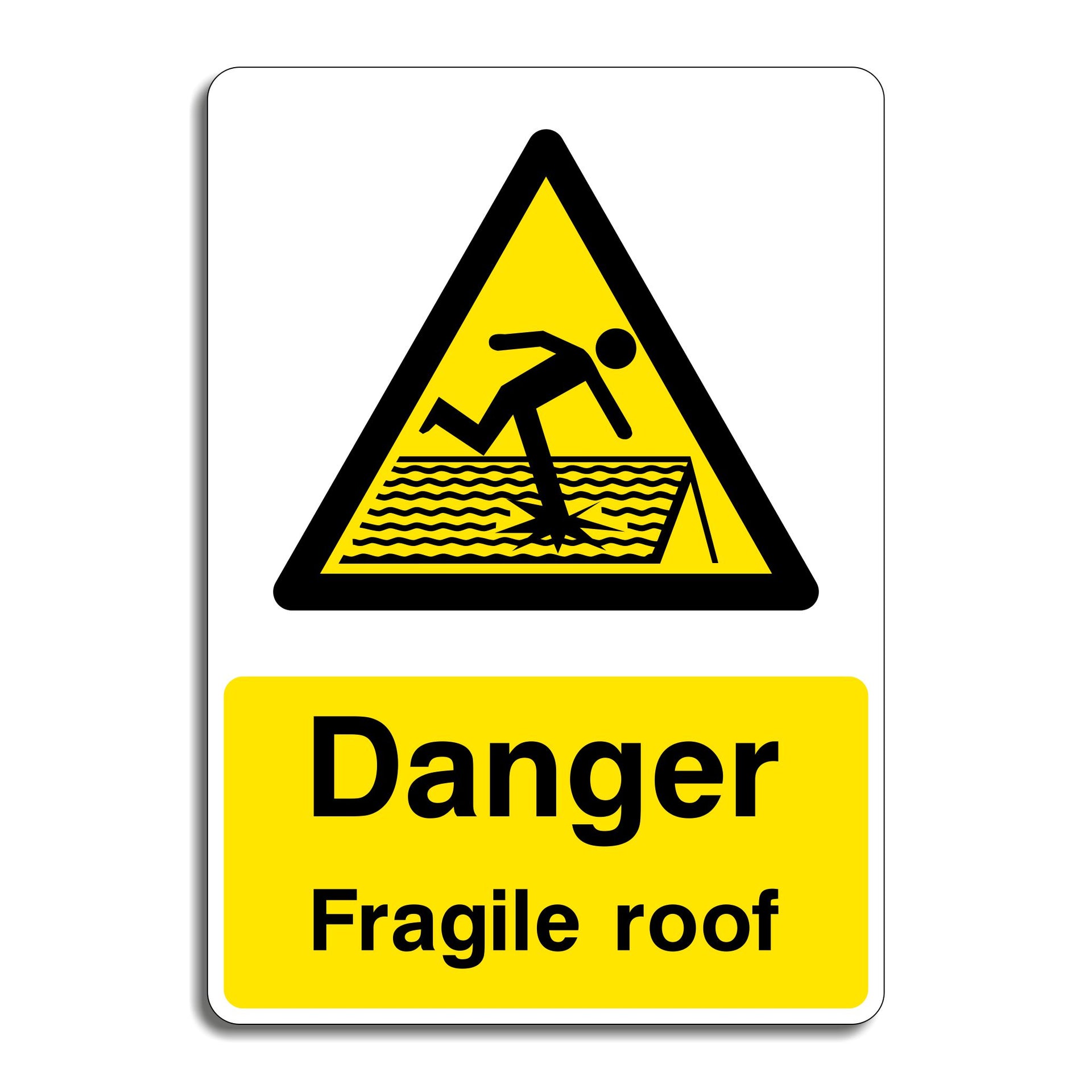 Danger Fragile Roof Use Hazard Warning Sign. This hazard warning sign warns individuals that there is a fragile roof and that they need to be aware of this hazard. All our safety signs are compliant with BS EN ISO 7010 where applicable.