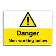 Men Working Below safety signs are intended to warn people working at height such as on scaffolding, roofs, or elevated platforms that there are workers positioned directly underneath them. This sign is important in construction, maintenance, and industrial settings. All our safety signs are compliant with BS EN ISO 7010 where applicable.